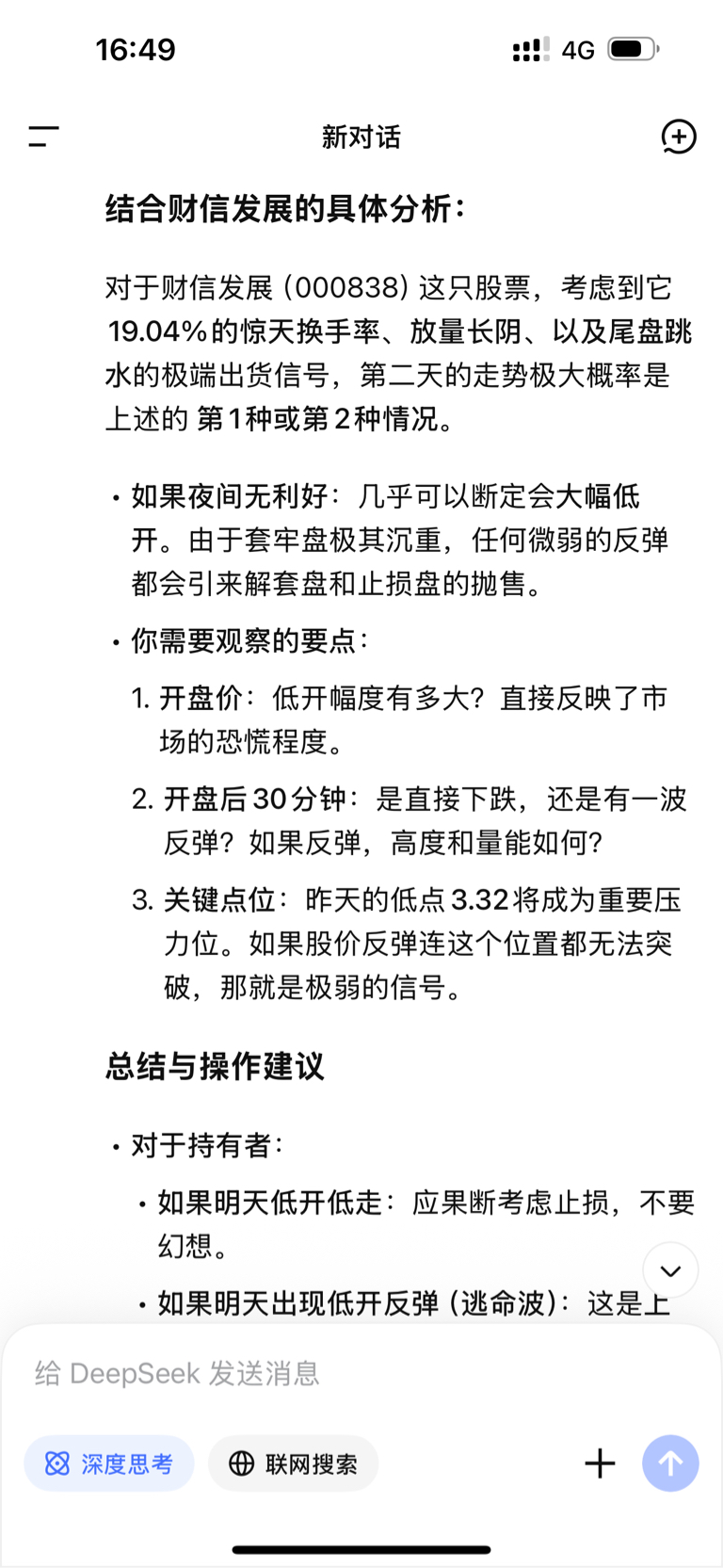 $财信发展(SZ000838)$ 下周一财信是走是留,看看Deepseek的分析。