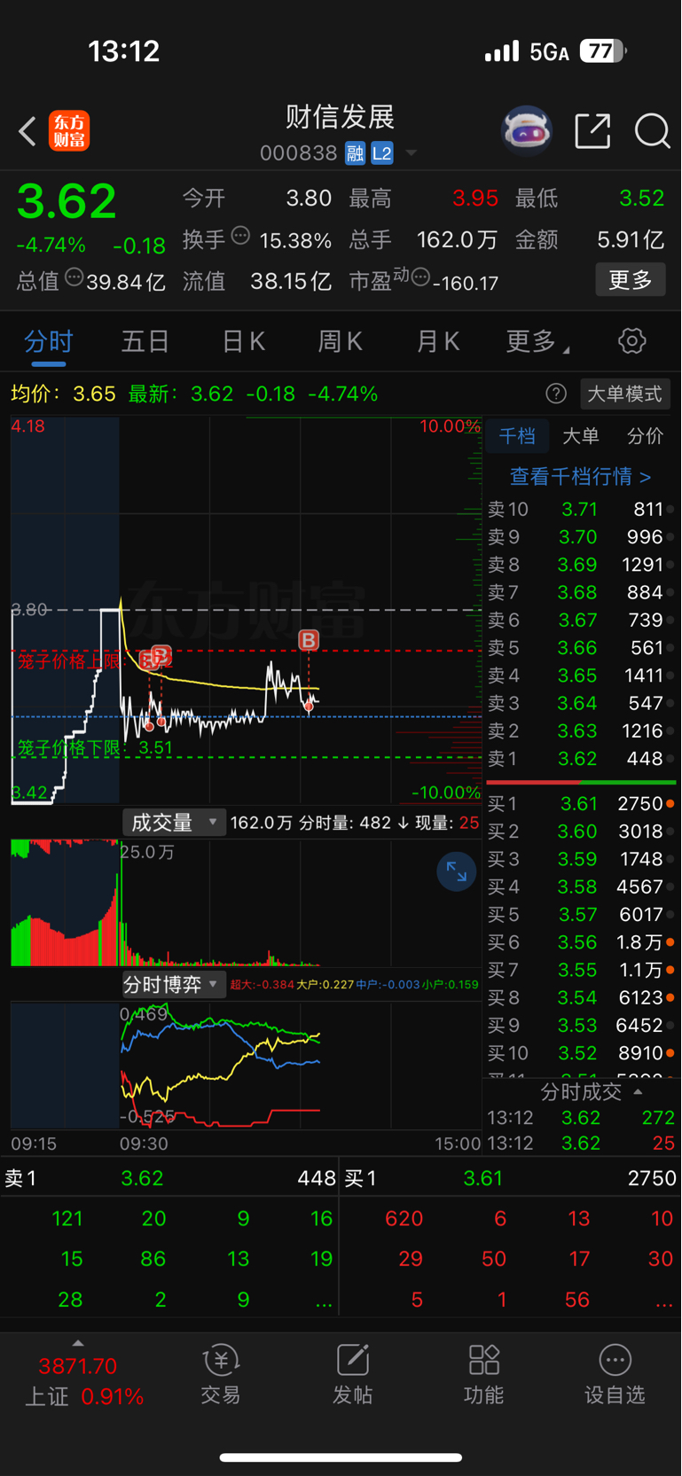 $财信发展(SZ000838)$ 昨天涨停尾盘被量化砸了,今天大跌,搞一笔试错