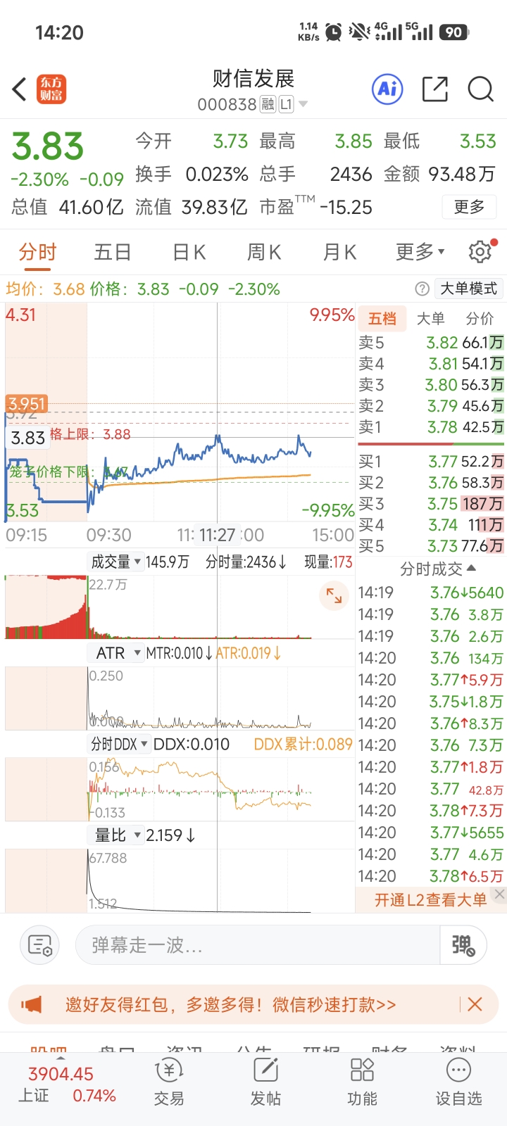 $财信发展(SZ000838)$ 今天最高点,懂了没