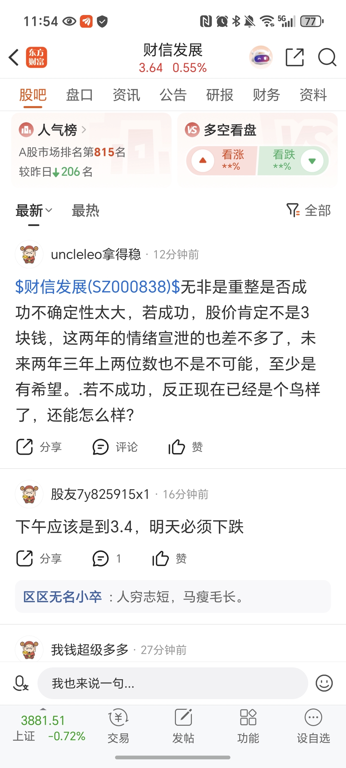 $财信发展(SZ000838)$ 恭喜各位,记住我说的话,人穷志短,马瘦毛长