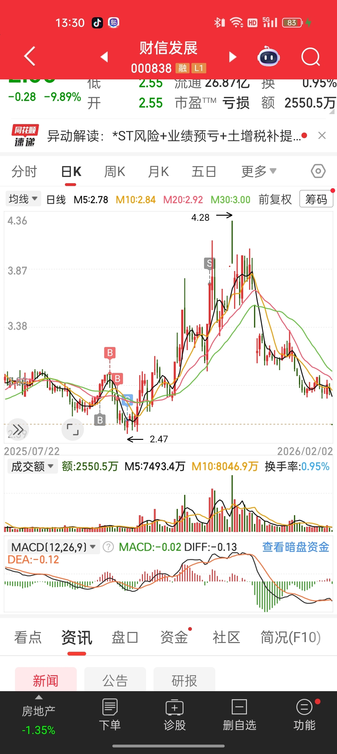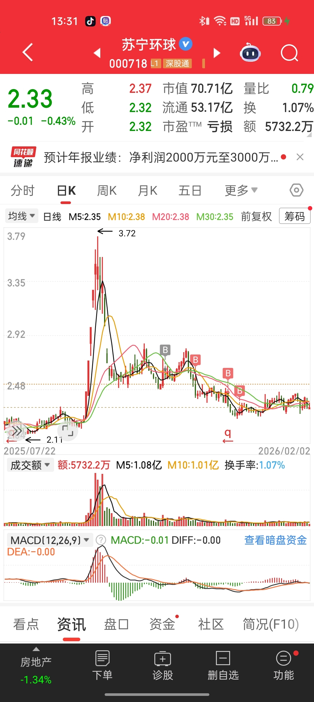 负资产了,我3.7跑的。然后现在苏宁环球,苏宁环球成本2.51。