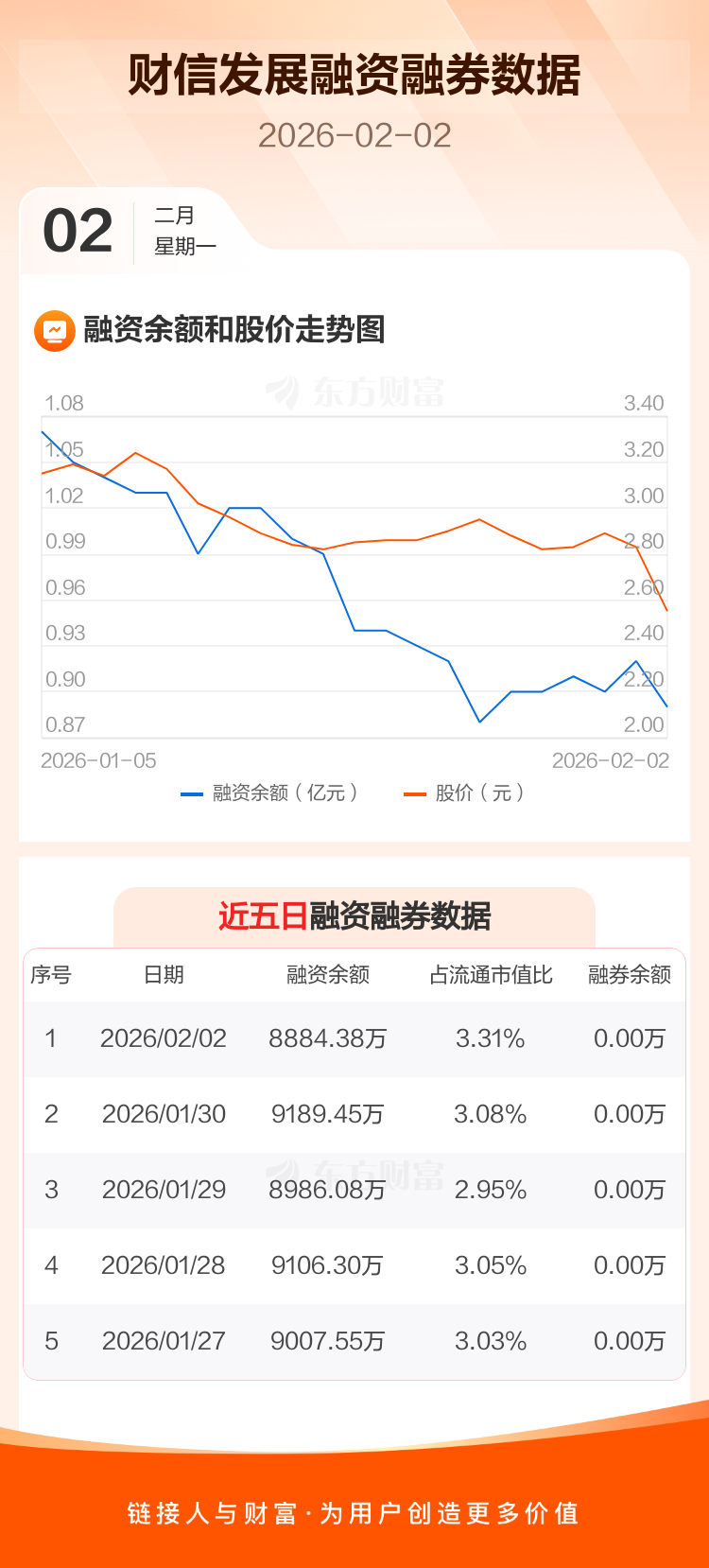 交易所最新数据显示,财信发展于2026年2月2日获融资买入14.15万元,融资偿还319.22万元,当日融资净偿还305.07万元。目前,该股融资余额8884.38万,占流通市值比例为3.31%。
