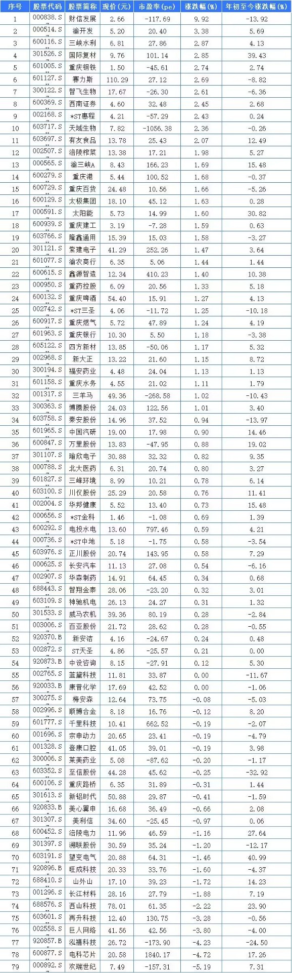2月4日,79家重庆A股上市公司中有54家上涨,2家平收,下跌23家。