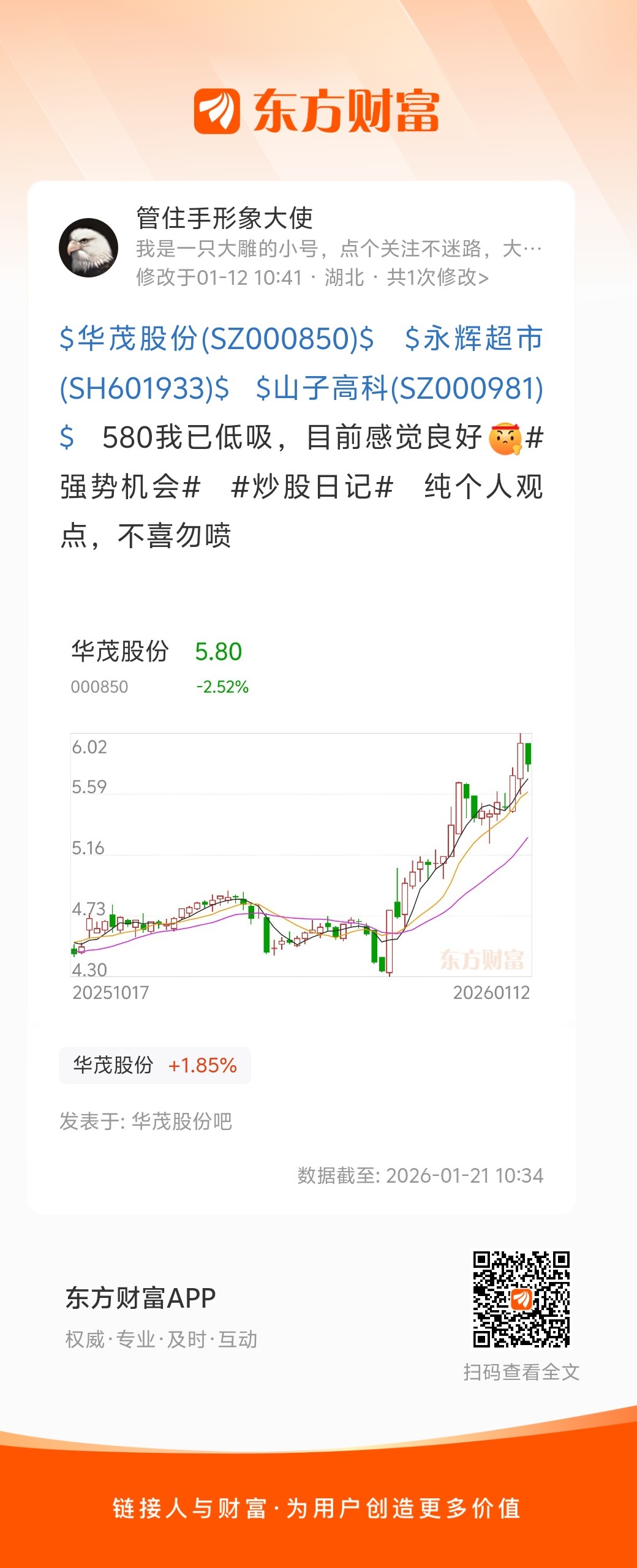 温馨提示: 1.根据《证券法》规定,禁止编造、传播虚假信息或者误导性信息,扰乱证券市场;2.用户在本社区发表的所有资料、言论等仅代表个人观点,与本网站立场无关,不对您构成任何投资建议。用户应基于自己的独立判断,自行决定证券投资并承担相应风险。《东方财富社区管理规定》