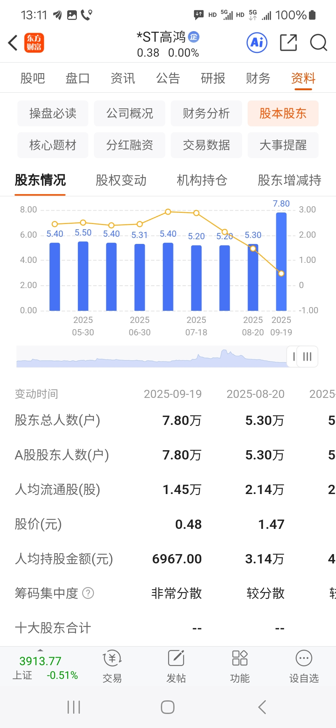 $*ST高鸿(SZ000851)$ 股东数量从5.3万到7.8万到最后的交易日9月26号估计现在股东数量几码还加几万户。后面从5.3万户后面的估计都是一两手那种门票户。是想割肉给门票户还是做长久股东呢?反正三板交易量低。在大A还是三板都一样跌停散户难卖出去。涨停也肯本买不进。是去是留就看个人对公司以后得罪想法不一样了。还有就是有资本故意做空。涨起来了基本根本买不到。跌停根本卖不出