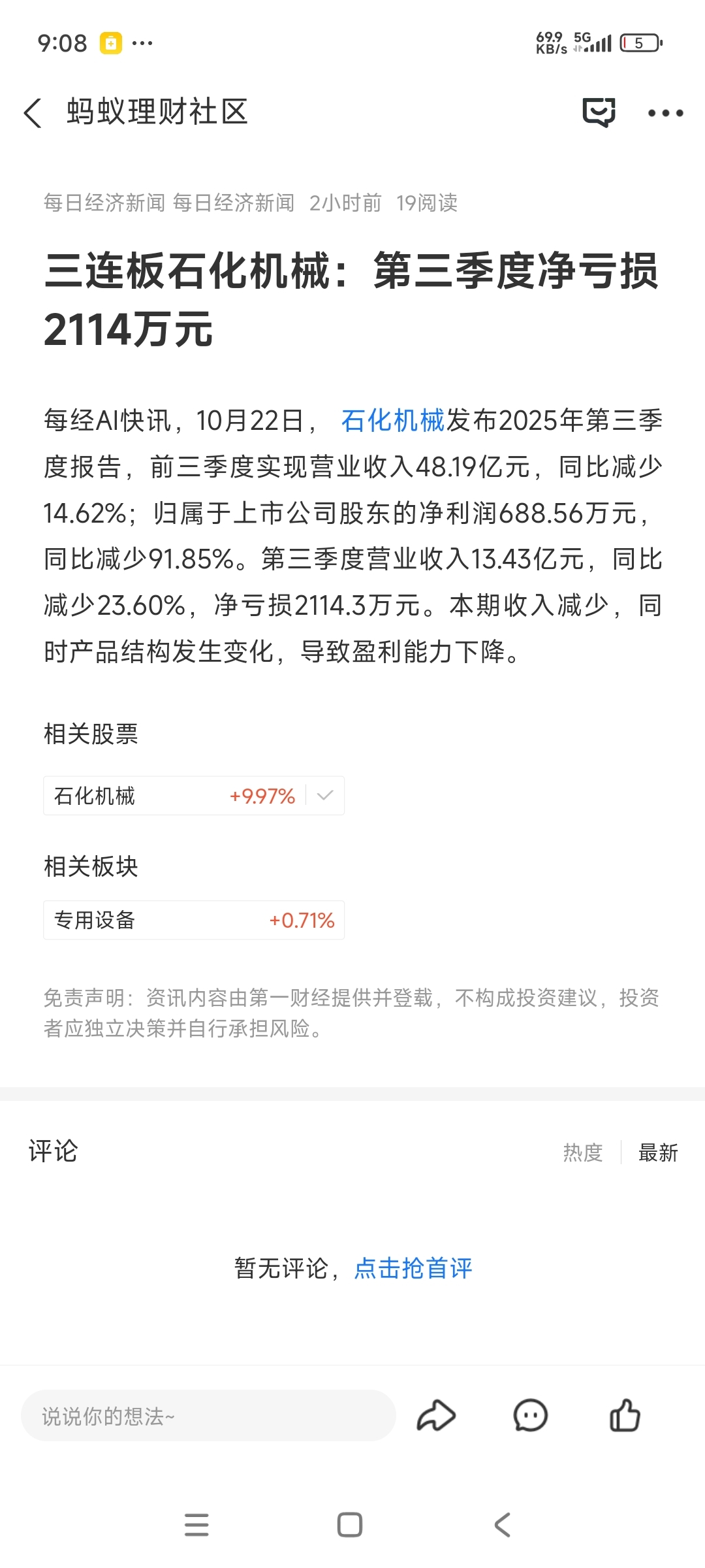 $石化机械(SZ000852)$ 还好今天没有排进去,明天随便买,总共才9个亿的公司,一个季度就亏2000万,1年不得亏1个亿了