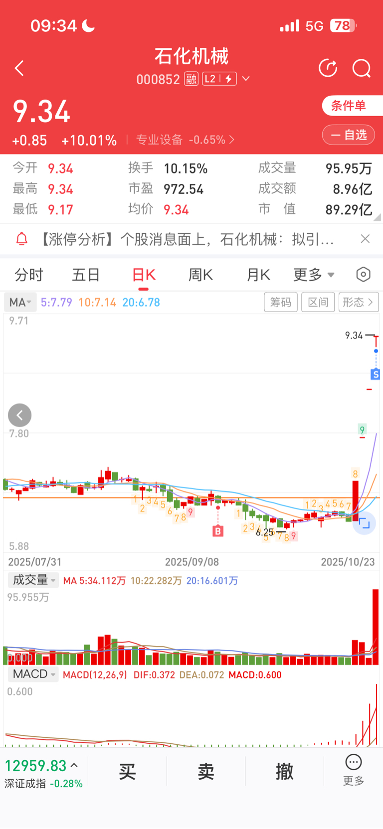 $石化机械(SZ000852)$ 条件单,开板卖了