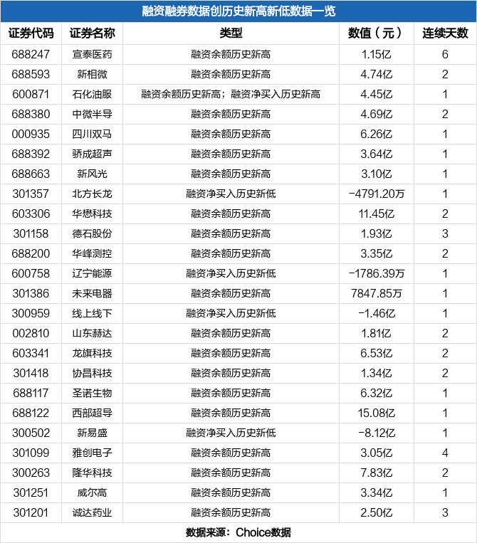 10月23日沪深两市共有93只股票两融数据创历史新高/新低,部分数据如下: