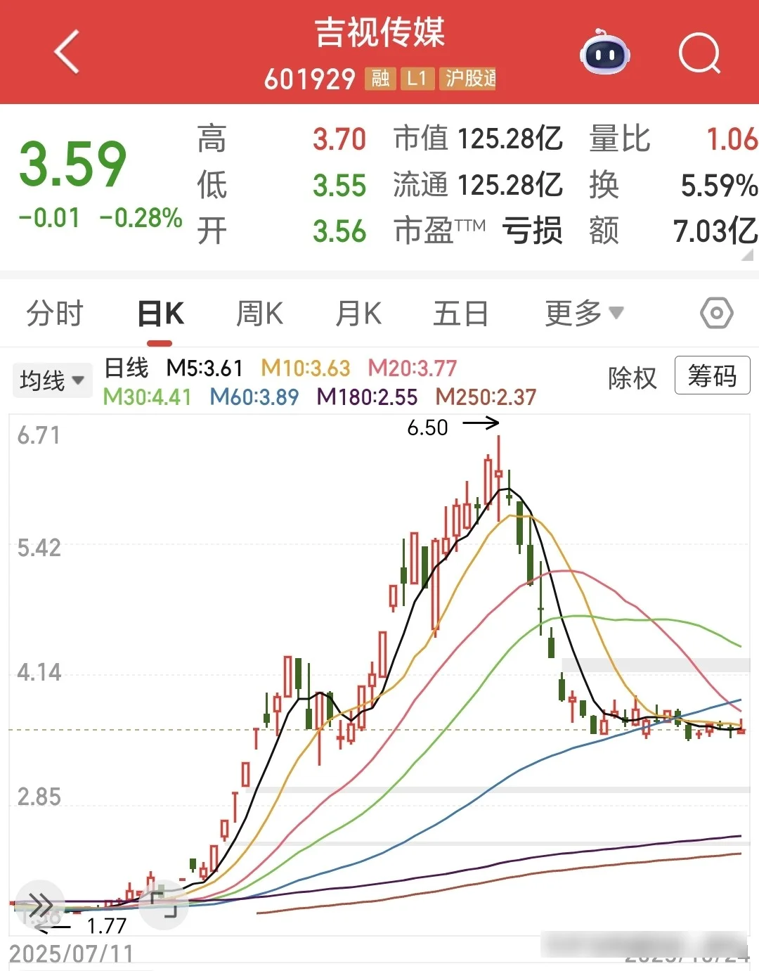 9月15日,吉视传媒股价见顶后即迎来之后的连续大跌,至9月25日,掉到仅3.55元,9个交易日内的区间跌幅达45.38%,随后一直横盘震荡至10月24日收盘时的3.59元。