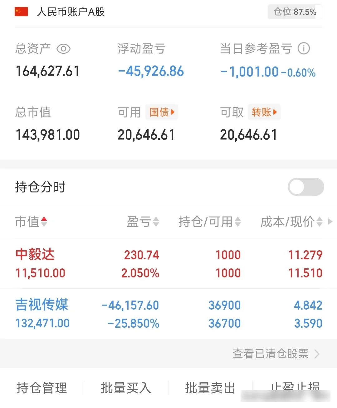 心有不甘的他在之后该股连续大跌的过程中不断补仓,手中的股票除了中毅达没舍得割完外,全都清仓将其几乎全投进吉视传媒中。