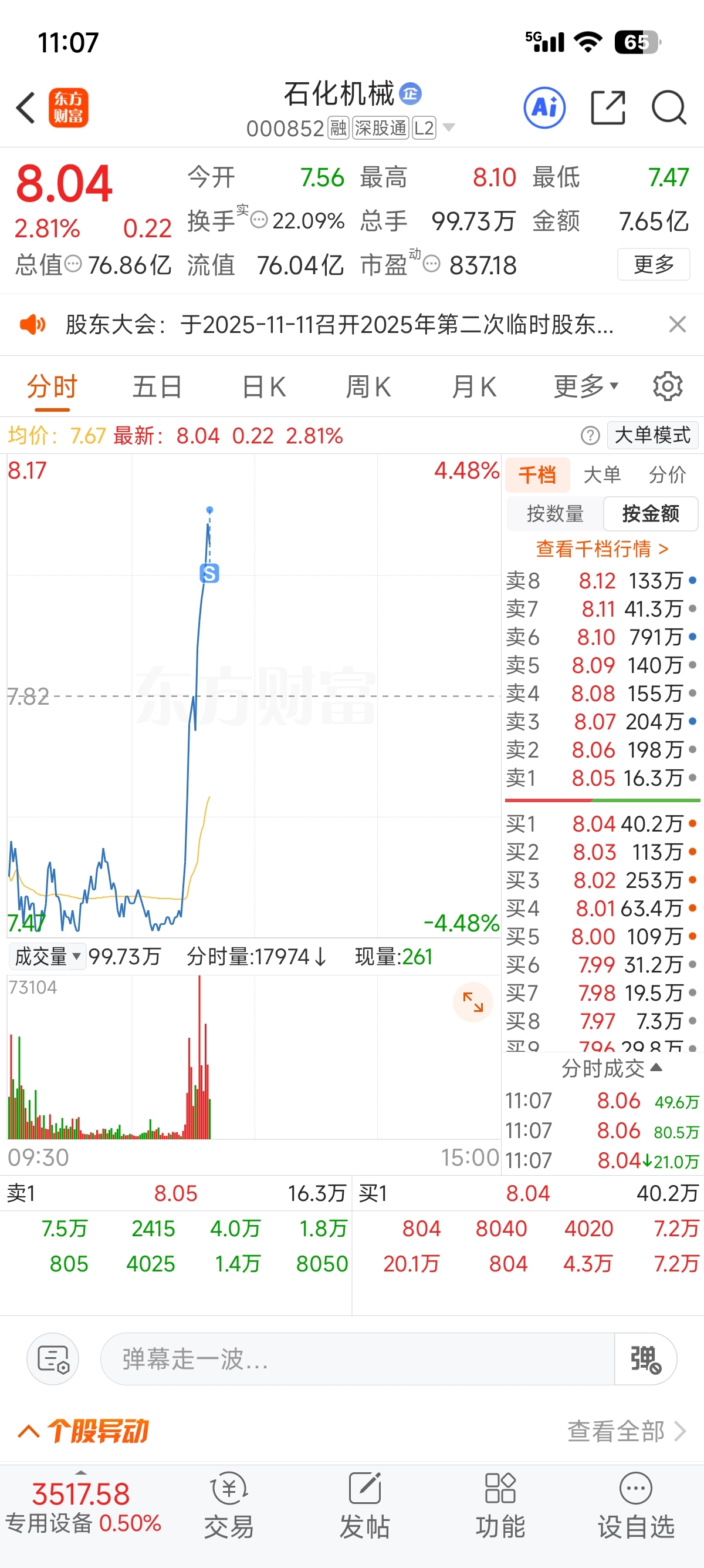 $石化机械(SZ000852)$ 8.09 T掉,等下来再接。