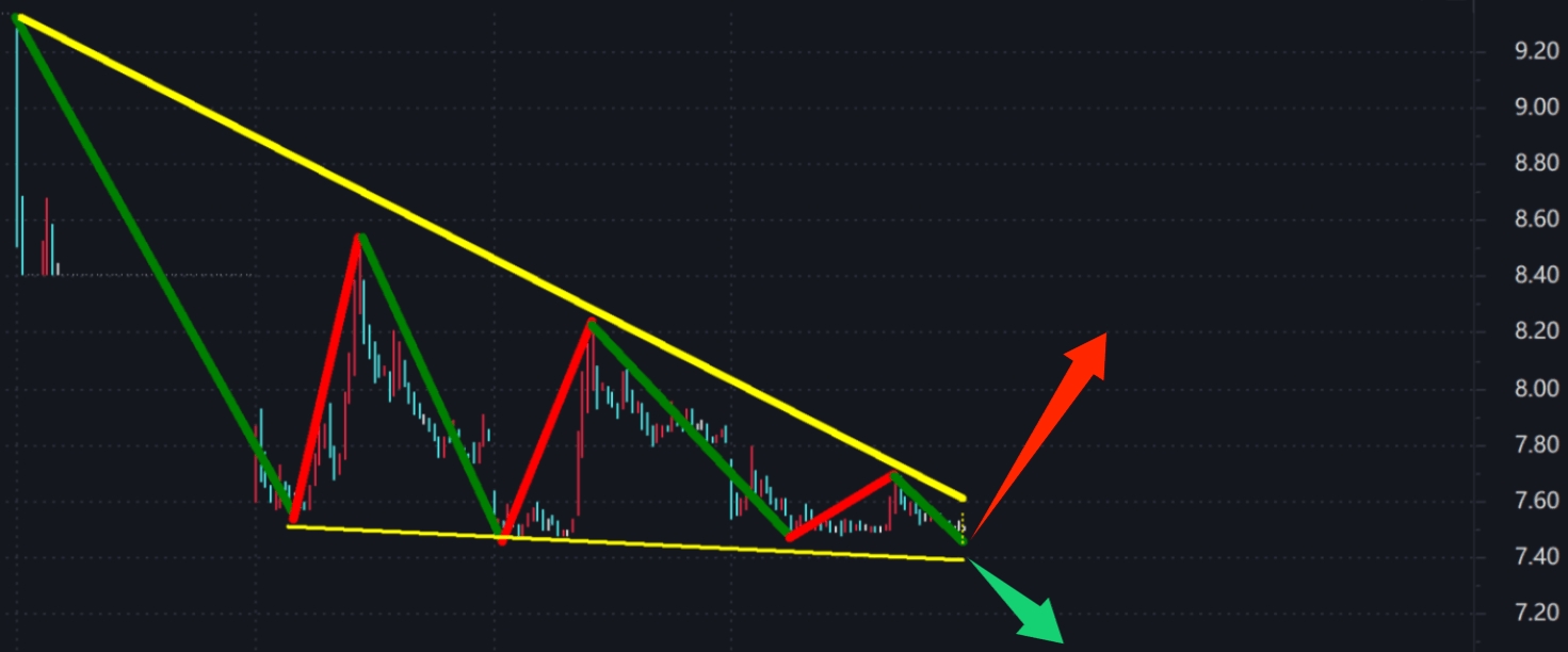 明天看起来是变盘节点了,看主力走的一个下跌收敛三角形,是上是下拭目以待吧,今天进