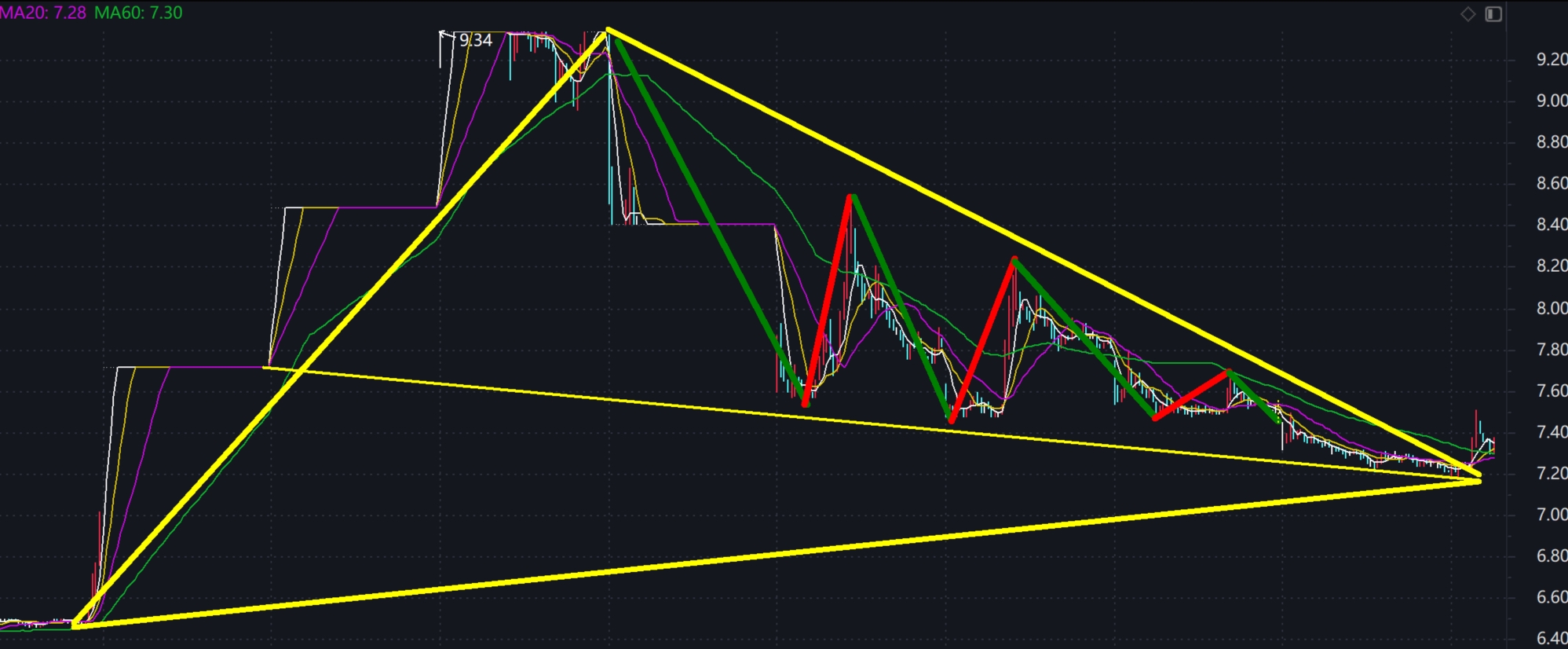 今天的低点跟二板形成了支撑,且形成了闭合三角形撑住了下跌K线,接着突破了下跌通道