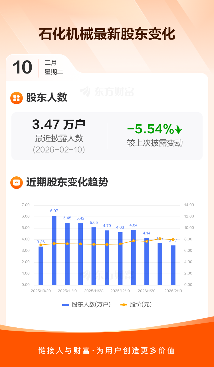 石化机械:截至2月10日最新股东户数3.47万户,较上期减少5.54%
