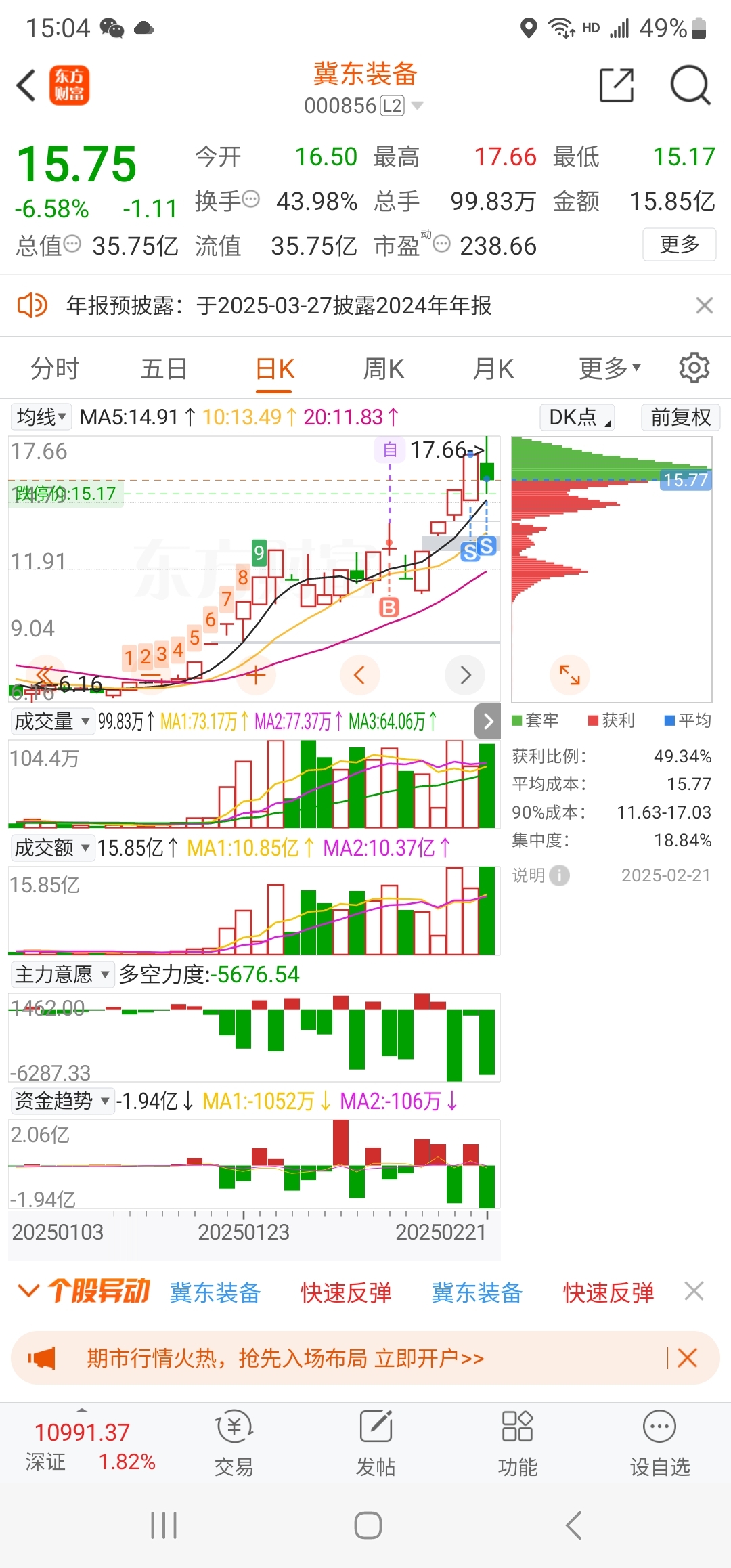 $冀东装备(SZ000856)$ 走了,下周二接回来