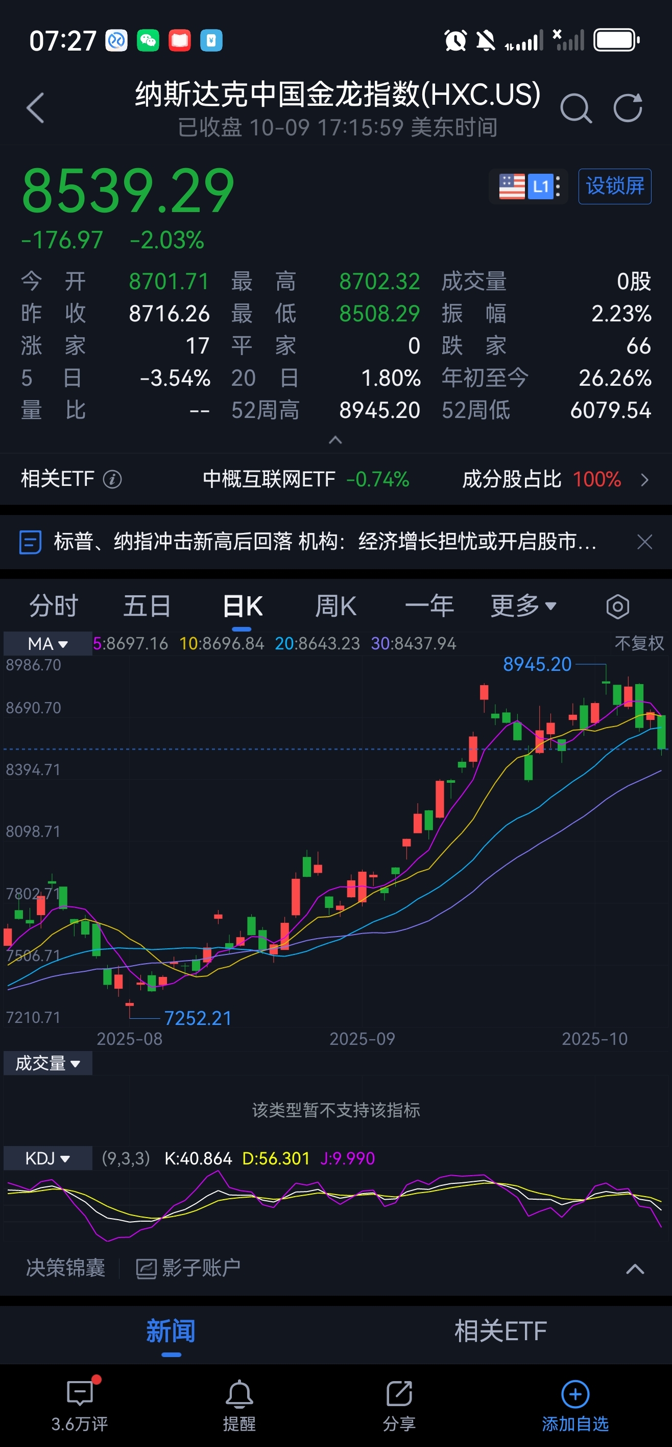昨晚,纳斯达克金龙指数,大跌2.03%。见顶了?