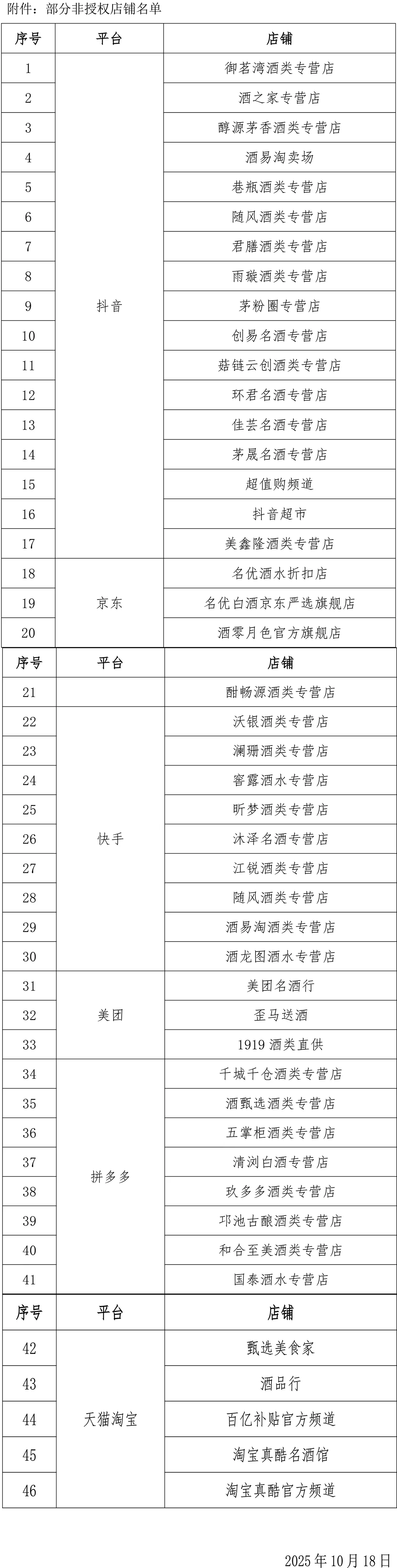 上证报中国证券网讯(记者高志刚)10月19日晚间,宜宾五粮液股份有限公司发布第四封致五粮液消费者的告知书,并公布46家(部分)非授权店铺名单。
