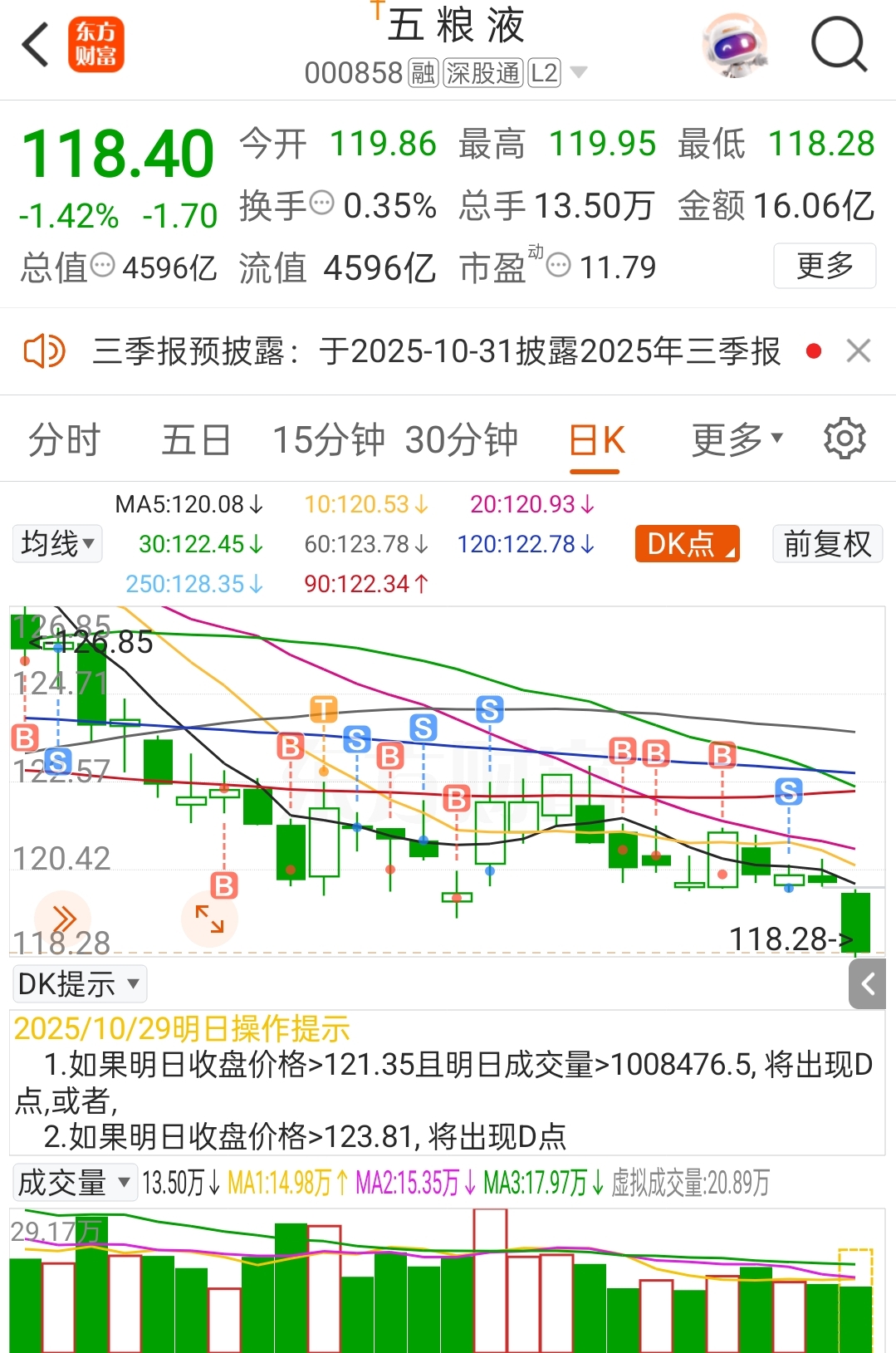 $五 粮 液(SZ000858)$ 提前一天清仓,昨天难受一天,看来业绩不好真的提前破位了