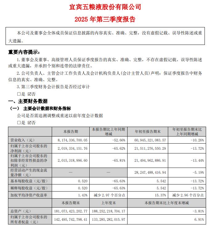 五粮液:第三季度营业收入同比下降52.66% 净利润同比下降65.62%