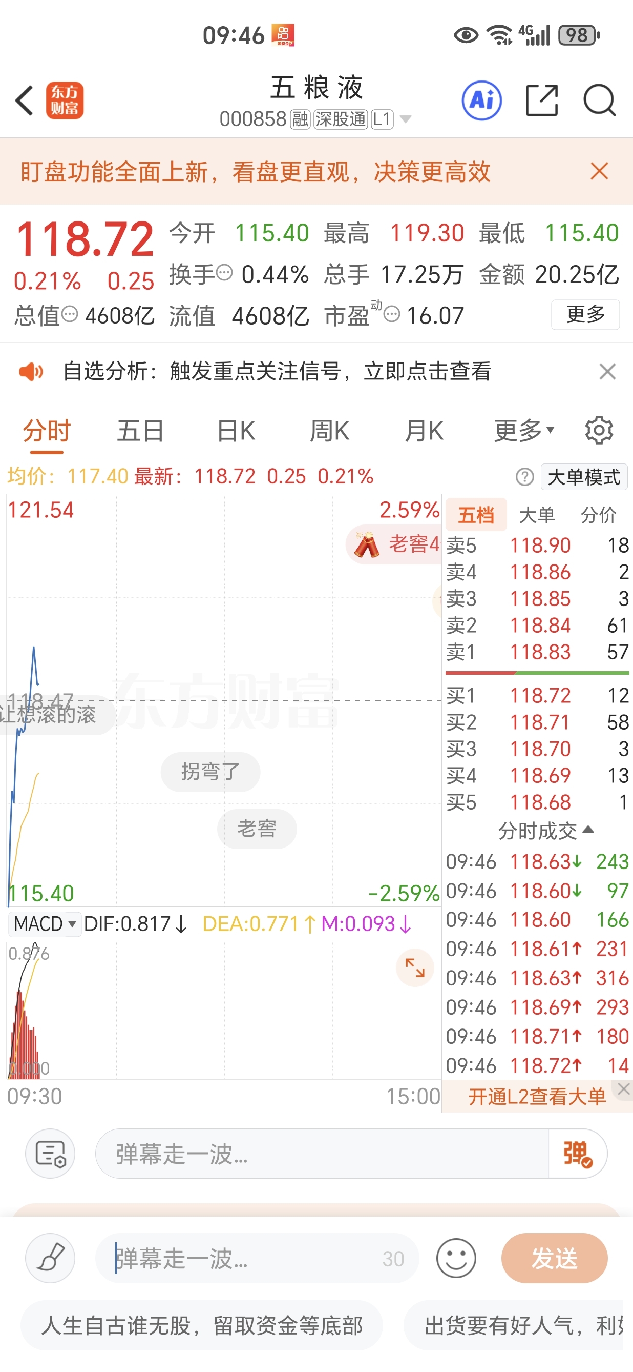 $五 粮 液(SZ000858)$ 截止9.46分老窖涨了6元,古井涨了9元,汾酒涨了7元,我的个乖乖我涨了0.24 最垃圾的没有之一
