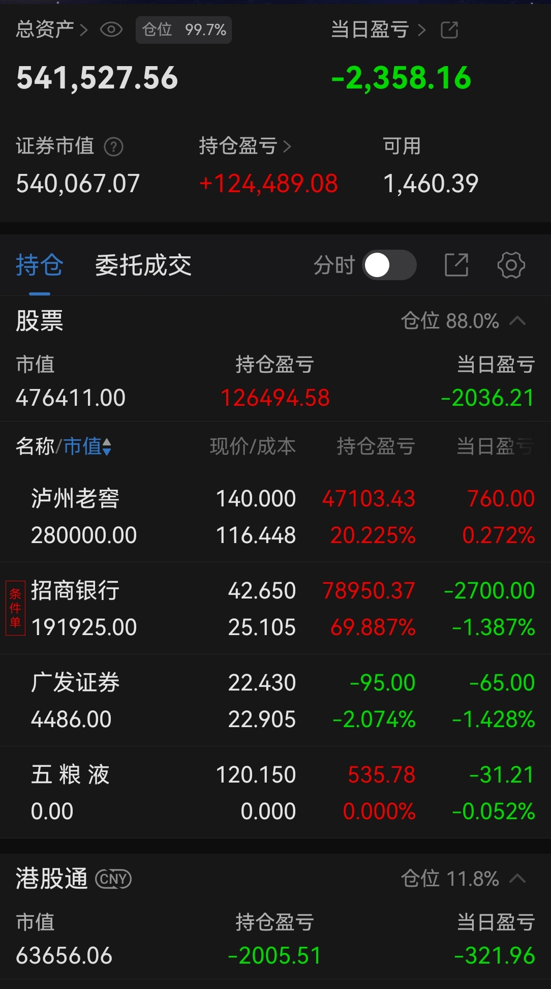 今天浮亏2358元。今天将500股全部卖掉了,并全部用于买入400股。以上,仅作