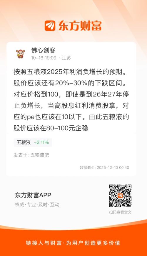 按照五粮液2025年利润负增长的预期。股价应该还有20%-30%的下跌区间。对应价格到100,即使是到26年27年停止负增长,当高股息红利消费股拿,对应的pe也应该在10以下。由此五粮液的股价应该在80-100元企稳