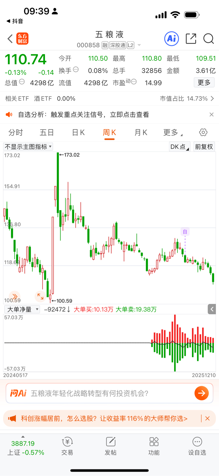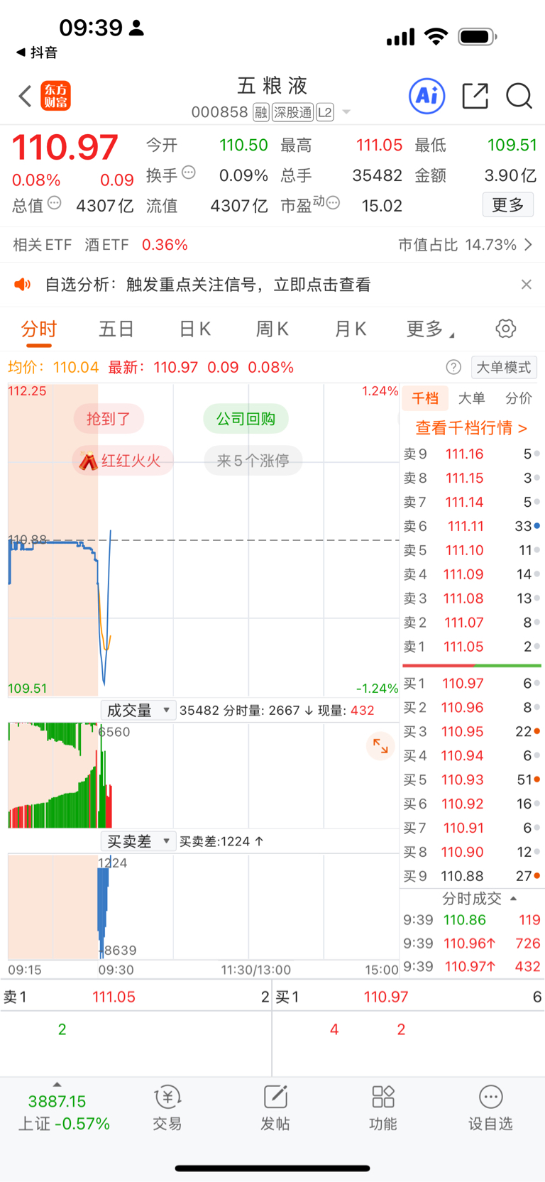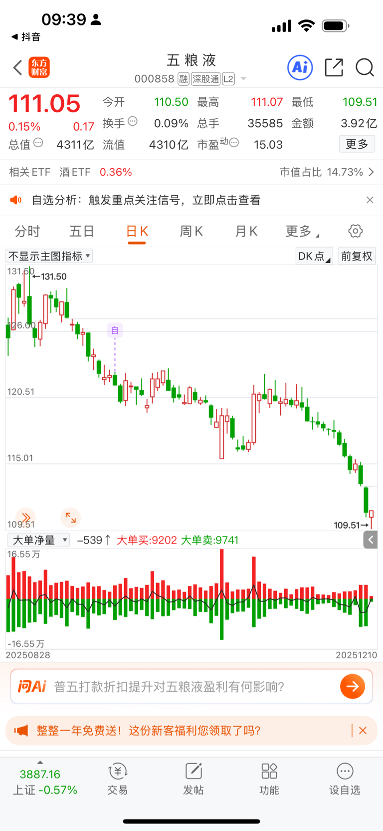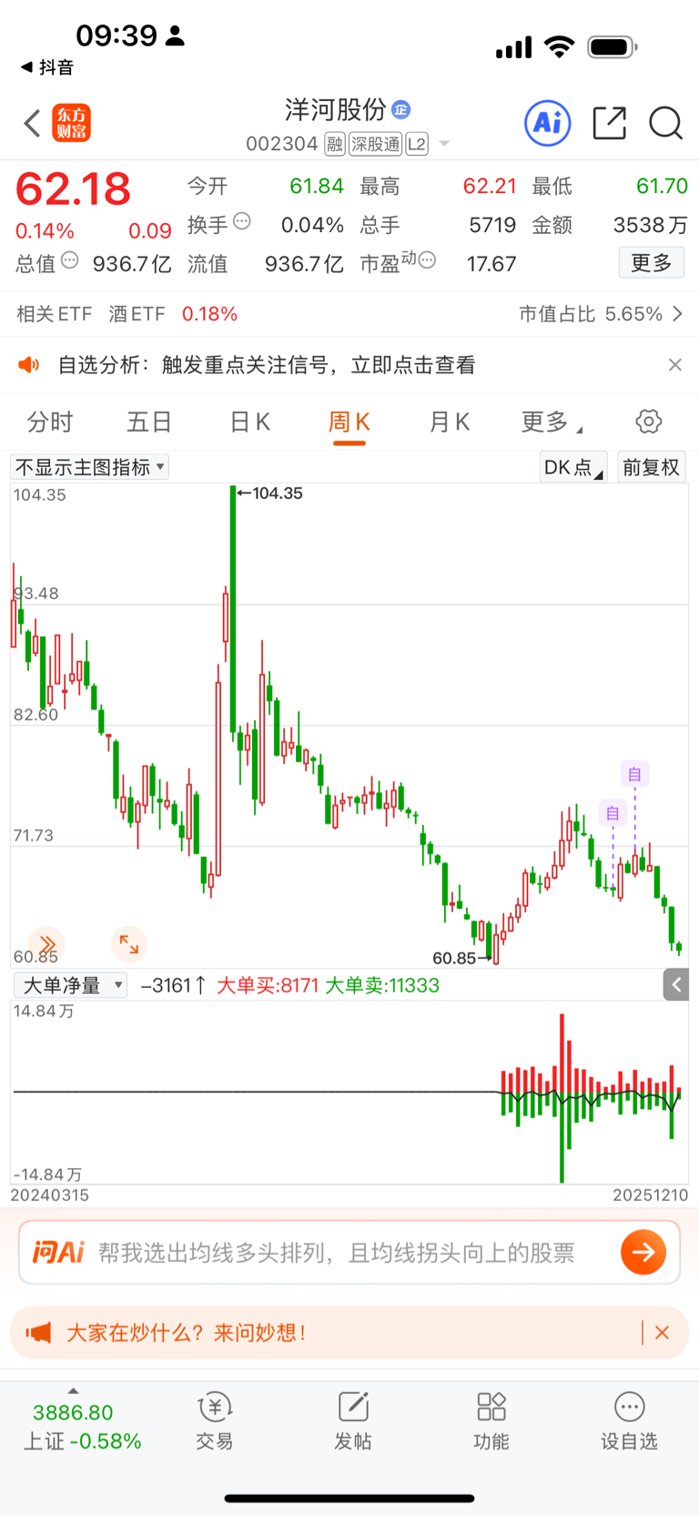 $洋河股份(SZ002304)$ 白酒在底部还连杀了一个月,最近走了加速,早上开盘继续下杀,暴打恐慌盘和融资客,该投降的基本上投降了,然后快速反弹,后期怎么走不知道,但是走加速下跌是好事,说明距离短期底部不远了!