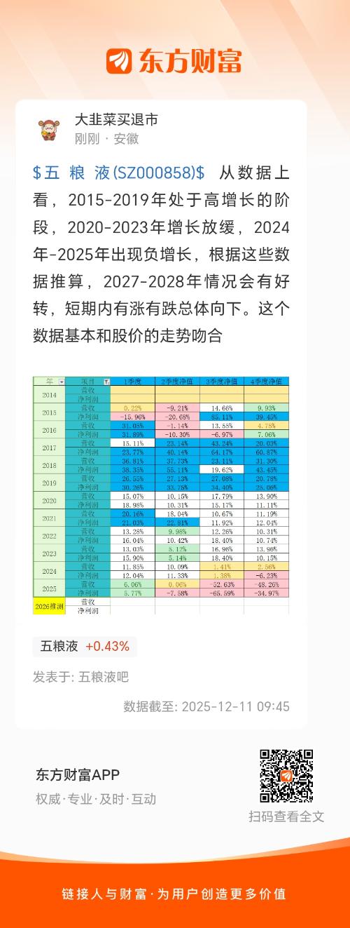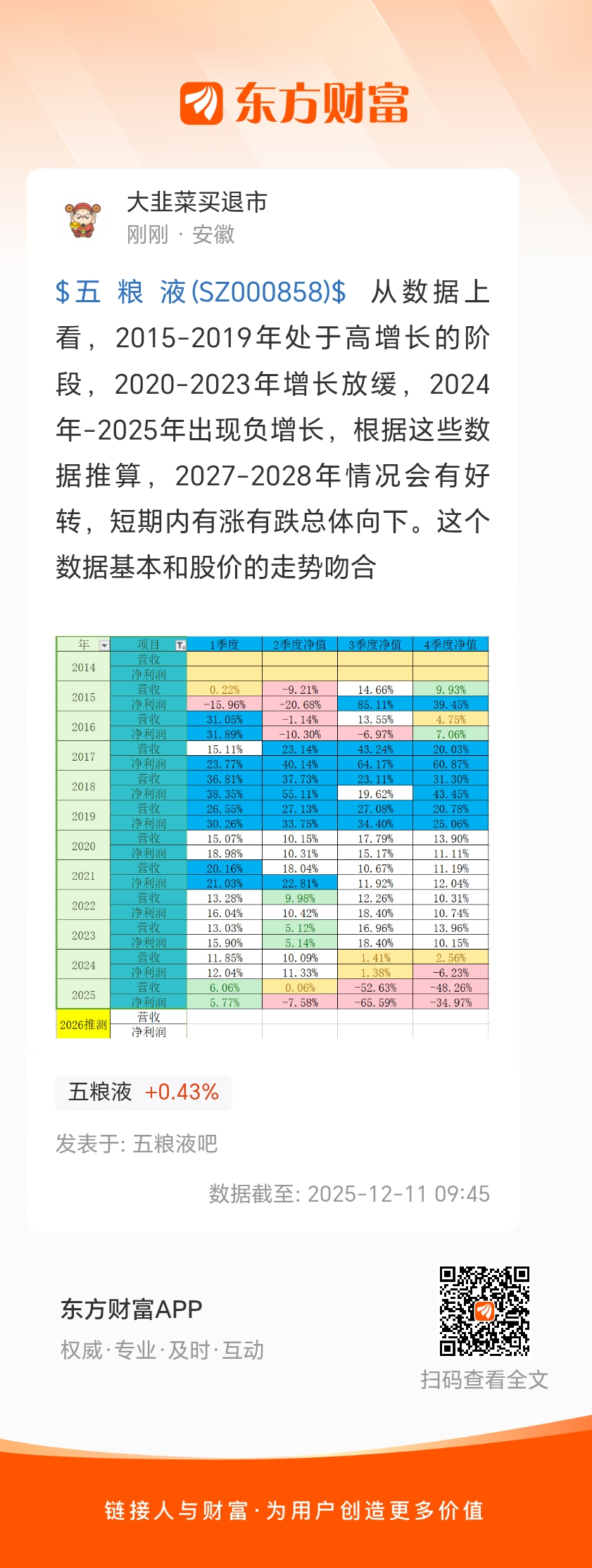 $五 粮 液(SZ000858)$ 从数据上看,2015-2019年处于高增长的阶段,2020-2023年增长放缓,2024年-2025年出现负增长,根据这些数据推算,2027-2028年情况会有好转,短期内有涨有跌总体向下。这个数据基本和股价的走势吻合