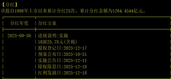 和五粮液发布中期分红派息实施公告同一天,贵州茅台(600519)也发布2025年中期权益分派实施公告。该公告称,本次利润分配方案经公司2025年11月28日召开的2025年第一次临时股东大会审议通过。