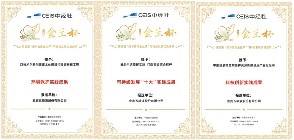 从守护一方水土到涵养整个产业生态,五粮液的绿色发展之路步履坚实。五粮液坚持以“绿色生产、低碳循环、生态标杆”能源环境方针为指引,扎实推动绿色低碳实践,先后获得全国首批循环经济试点单位、清洁生产示范单位、国家级“绿色工厂”等系列荣誉,其“推动全链降碳实践打造零碳酒企标杆”“中国白酒微生物菌种资源库建设及产业化应用案例”和“以技术创新创建废水处理减污降碳样板工程”三项实践成果分别入选第四届“新华信用金兰杯”可持续发展“十大”实践成果、科技创新实践成果和环境保护实践成果。五粮液为全球可持续发展贡献中国酒企的绿色智慧,真正实现“从一粒种子到一滴美酒”的绿色承诺。