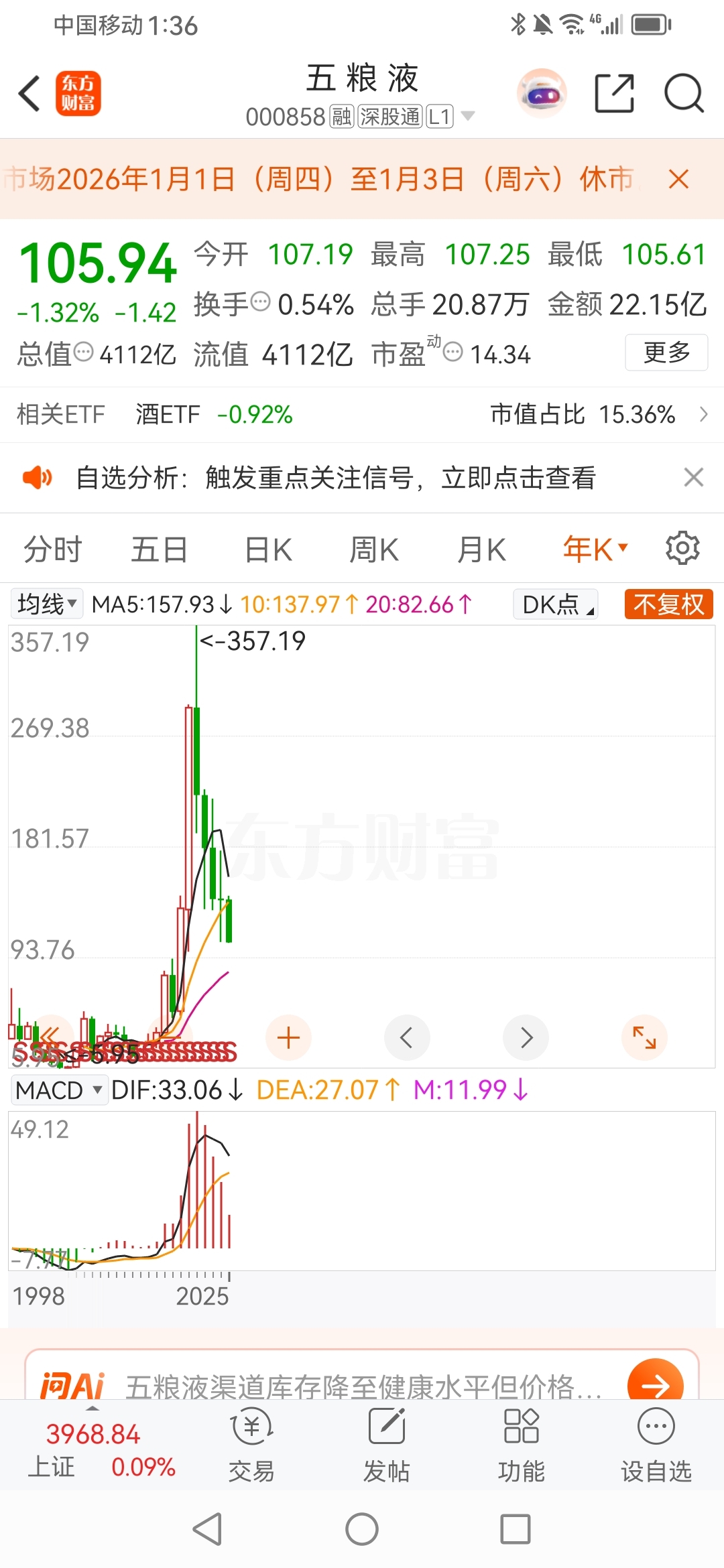 $五 粮 液(SZ000858)$ 10年线已经跌破,看20年线82.66元强支撑