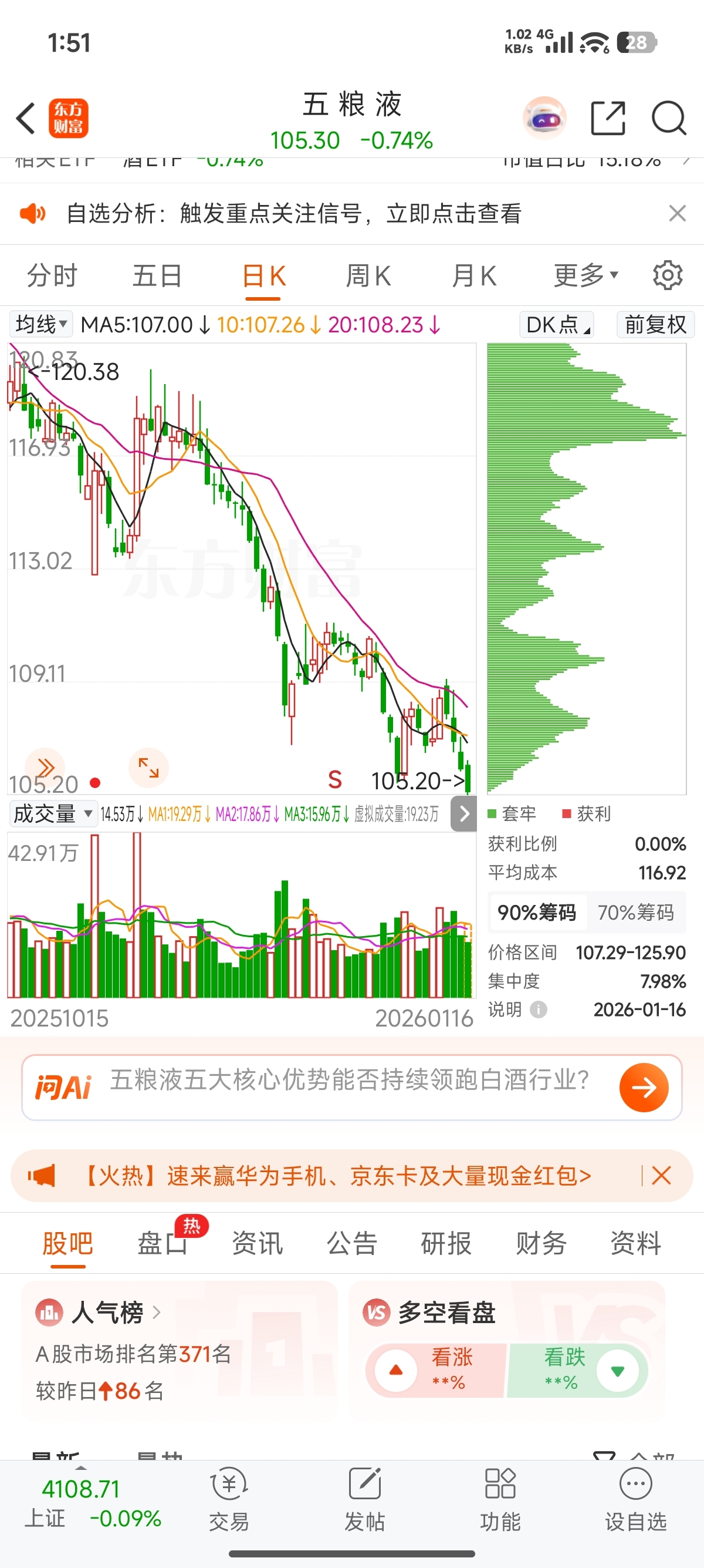 $五 粮 液(SZ000858)$ 获利比例0%,主力也亏钱啊