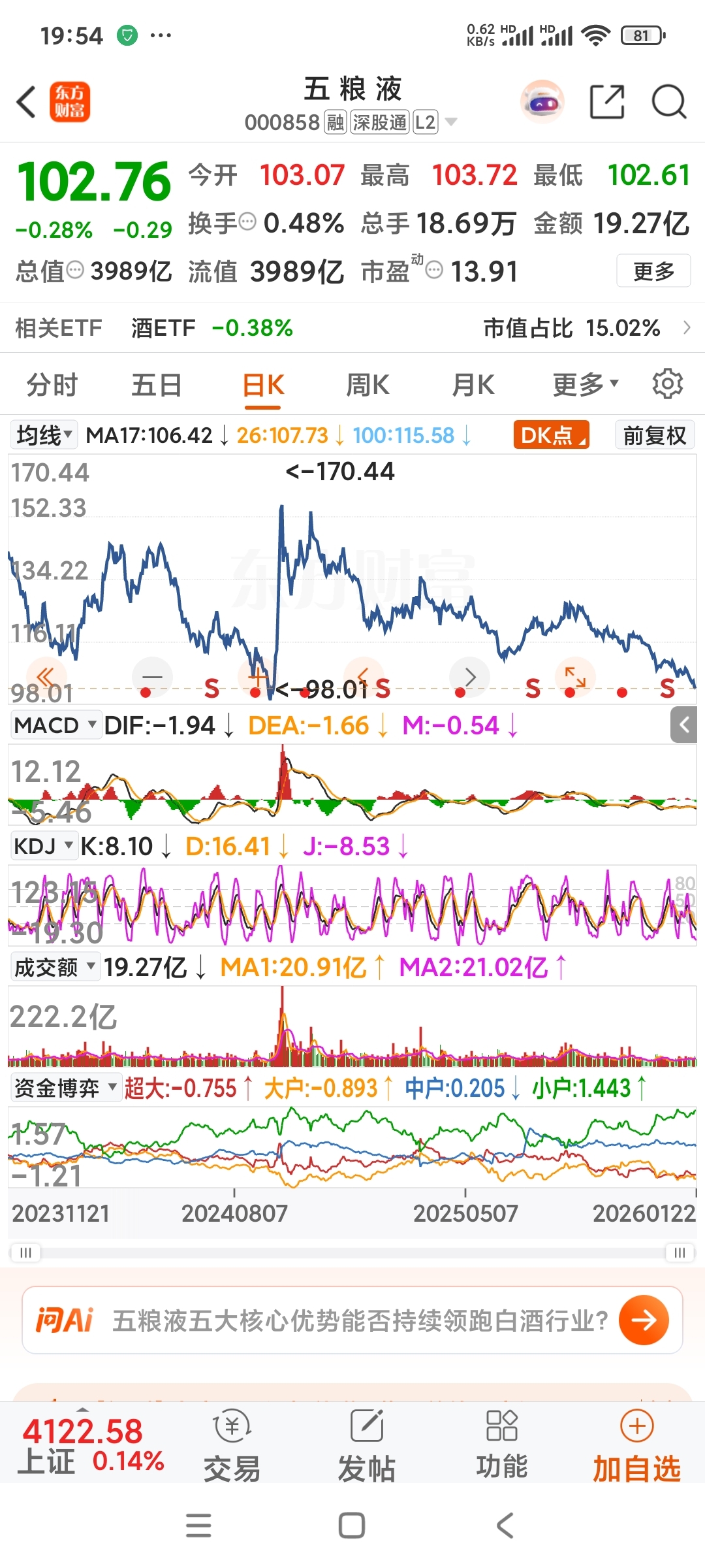 $五 粮 液(SZ000858)$ 还是要站好队!那些老概念一直觉得白酒好有价值!如果拿到现在可能牛市与你无关!长期下降趋势的坚决不碰!除非哪天反转了!