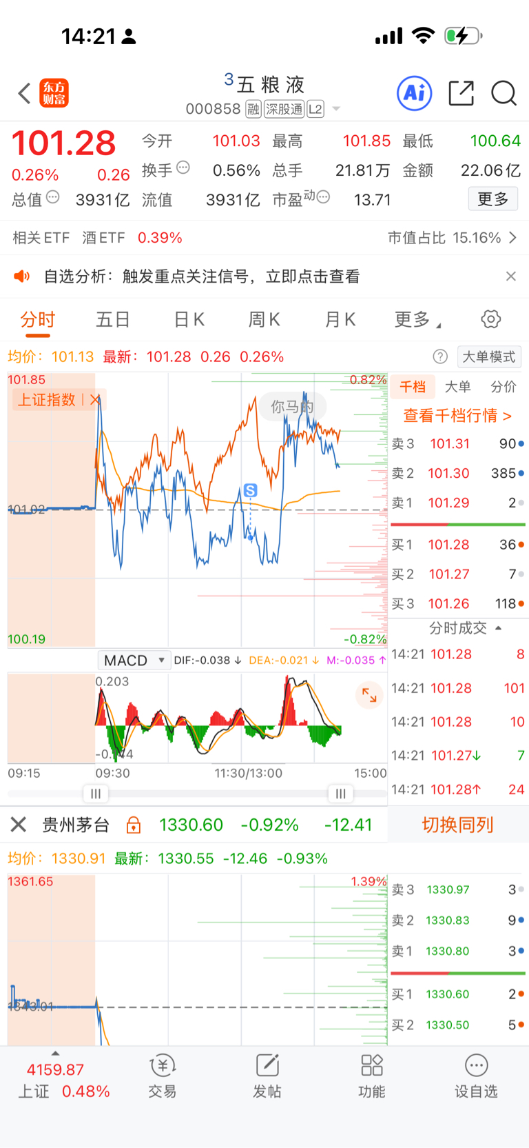 $五 粮 液(SZ000858)$ 还是很弱,或许我的割肉并不能带来反转,下午的反弹他只是看看能不能把我再吸引进去,也许他的主线任务就是破百,或者创924新低,希望早日反转!