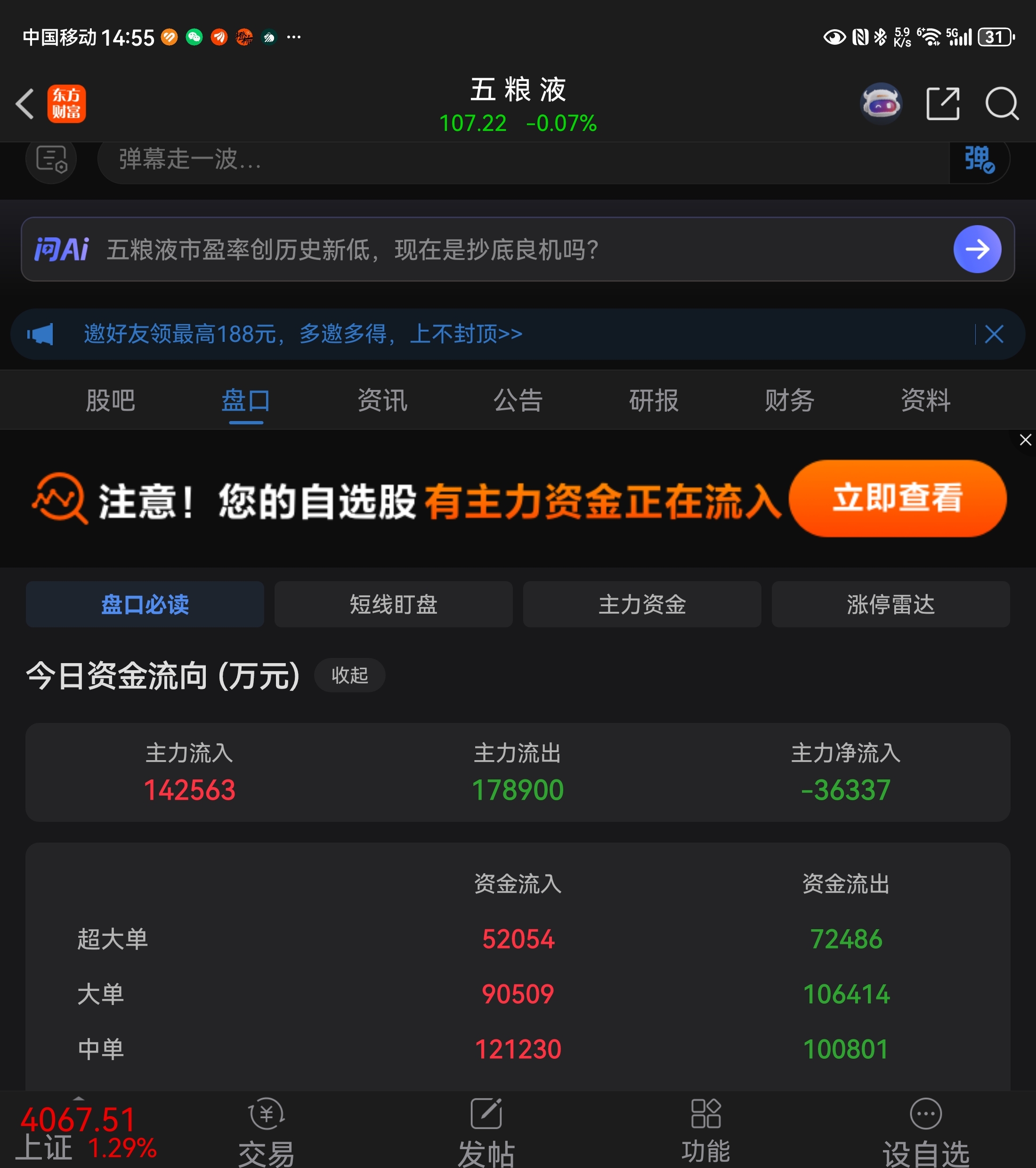 $五 粮 液(SZ000858)$ 尾盘流进来了1千万,目前流出3.6亿