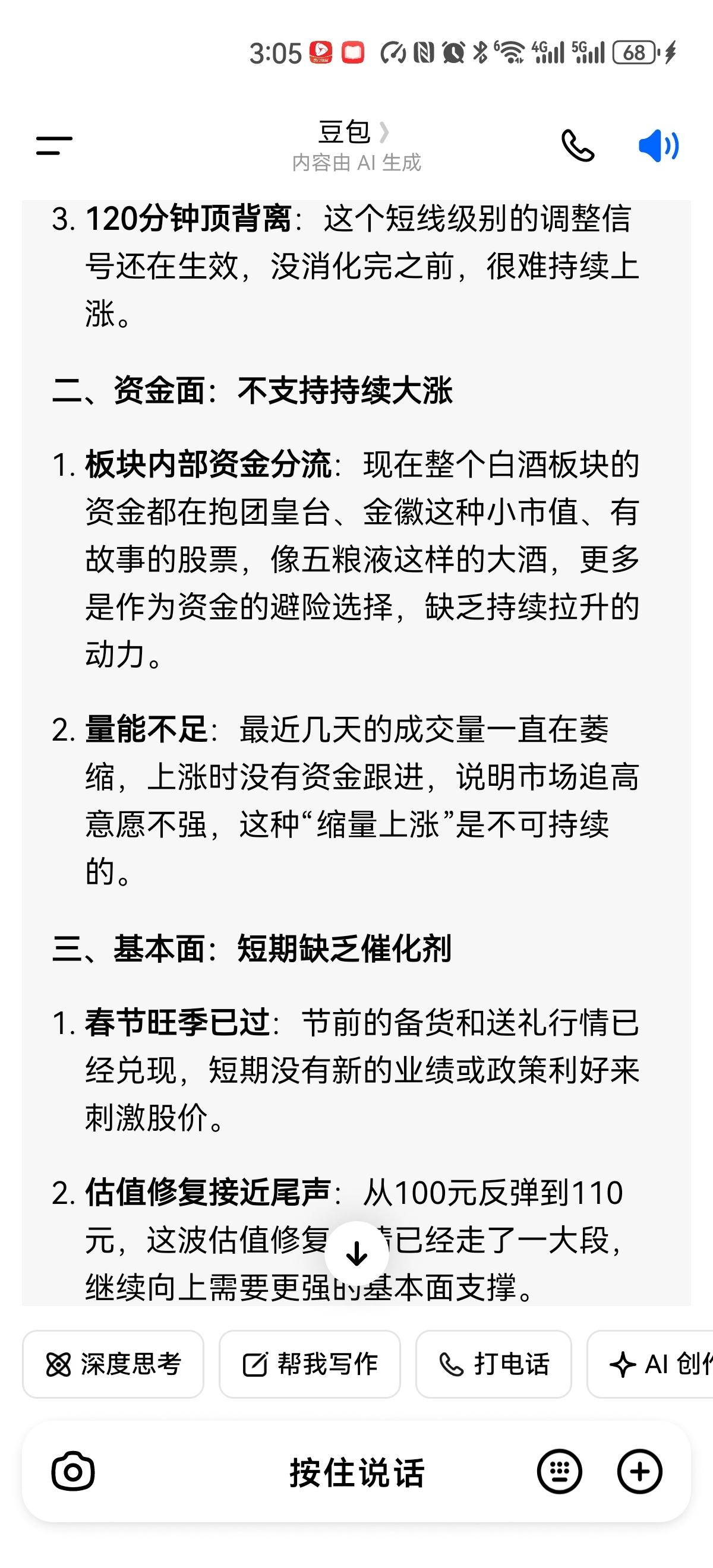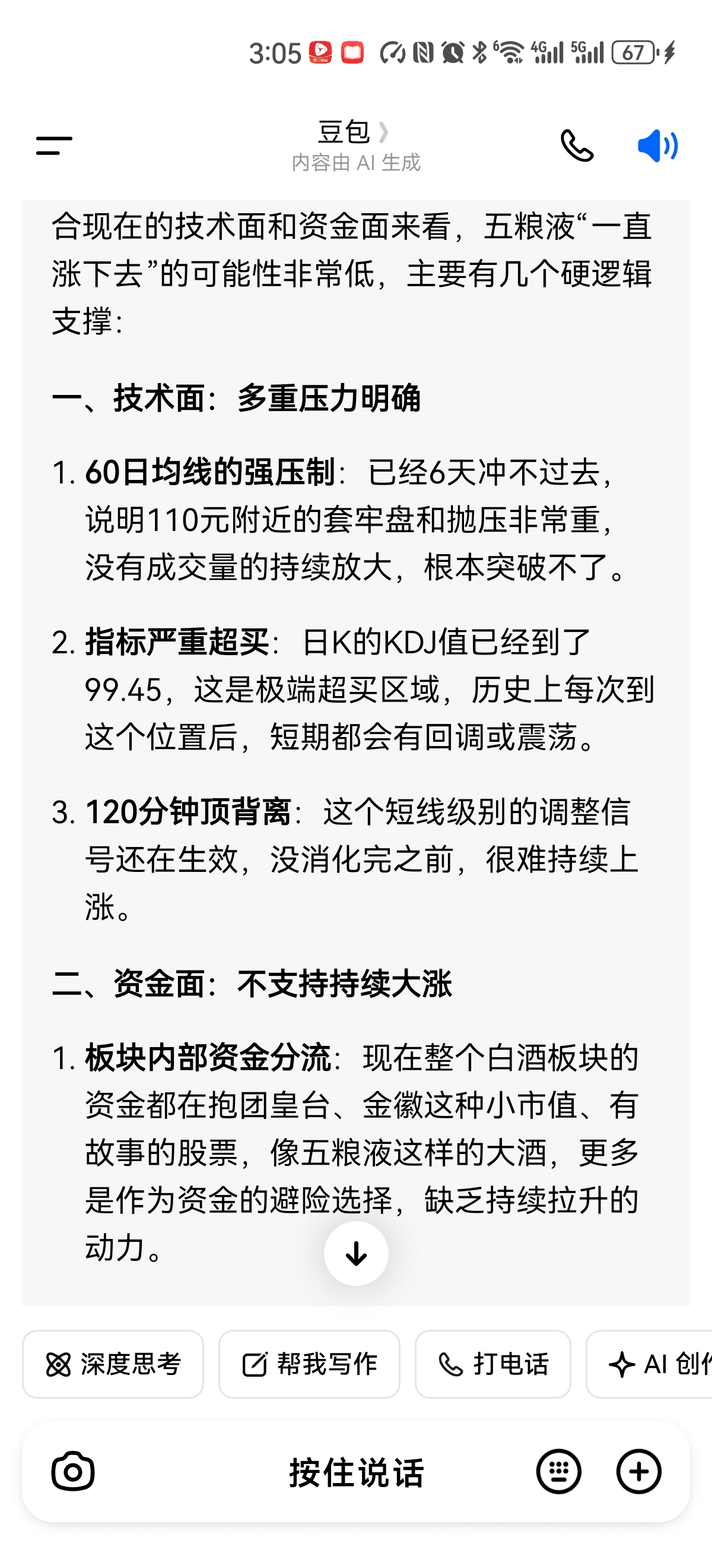 我刚刚问一下豆包,让她分析一下五粮液能不能一直涨到节后,实现反转。不知道她会不会