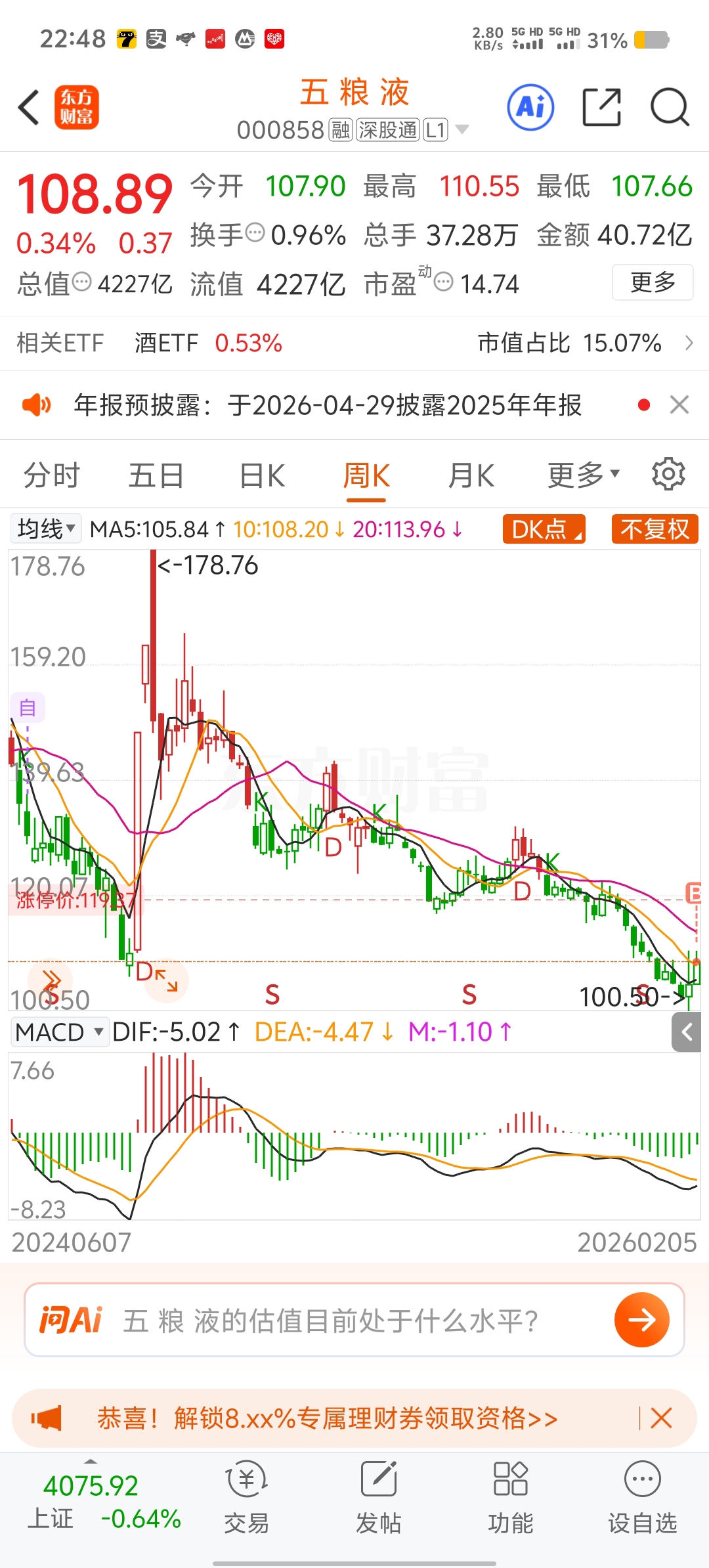 $五 粮 液(SZ000858)$ 明天应该不太好,因为从来不买白酒的我来了。