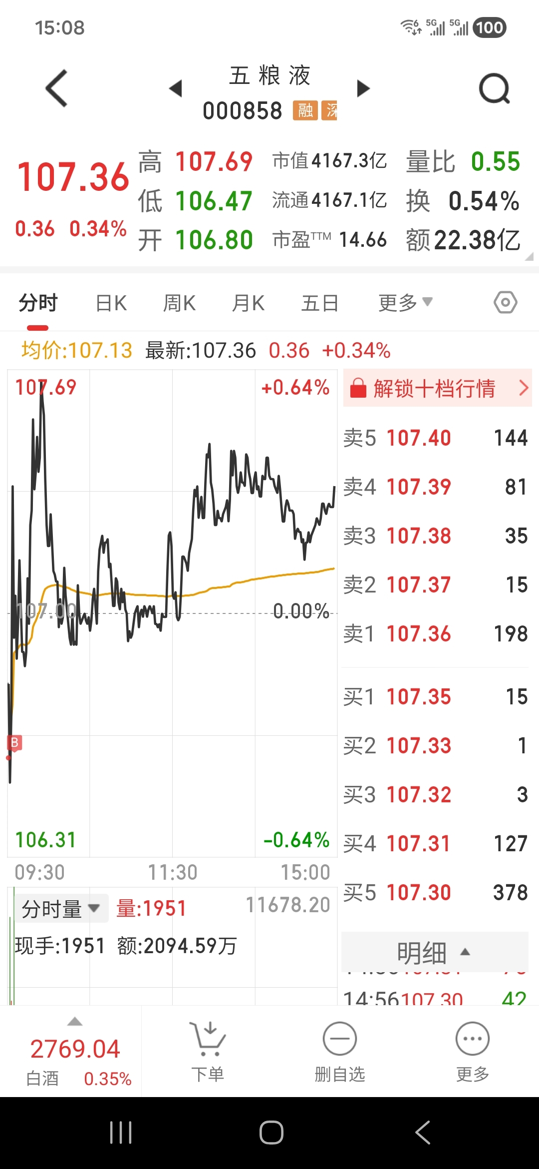 $五 粮 液(SZ000858)$ 今日早盘106.59元买了一点,相对前两天也是早盘7.31元买入的分众传媒好得多,这次五粮液收盘没有回到买入点,加上上证指数大涨的配合总算令到五粮液红盘收市,满意!