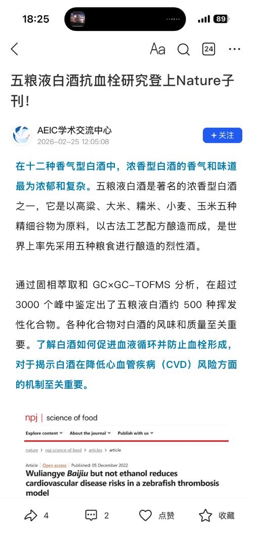 重磅最新研发成果:五粮液白酒能促进血液循环并防止血栓形成,降低心血管疾病发生。