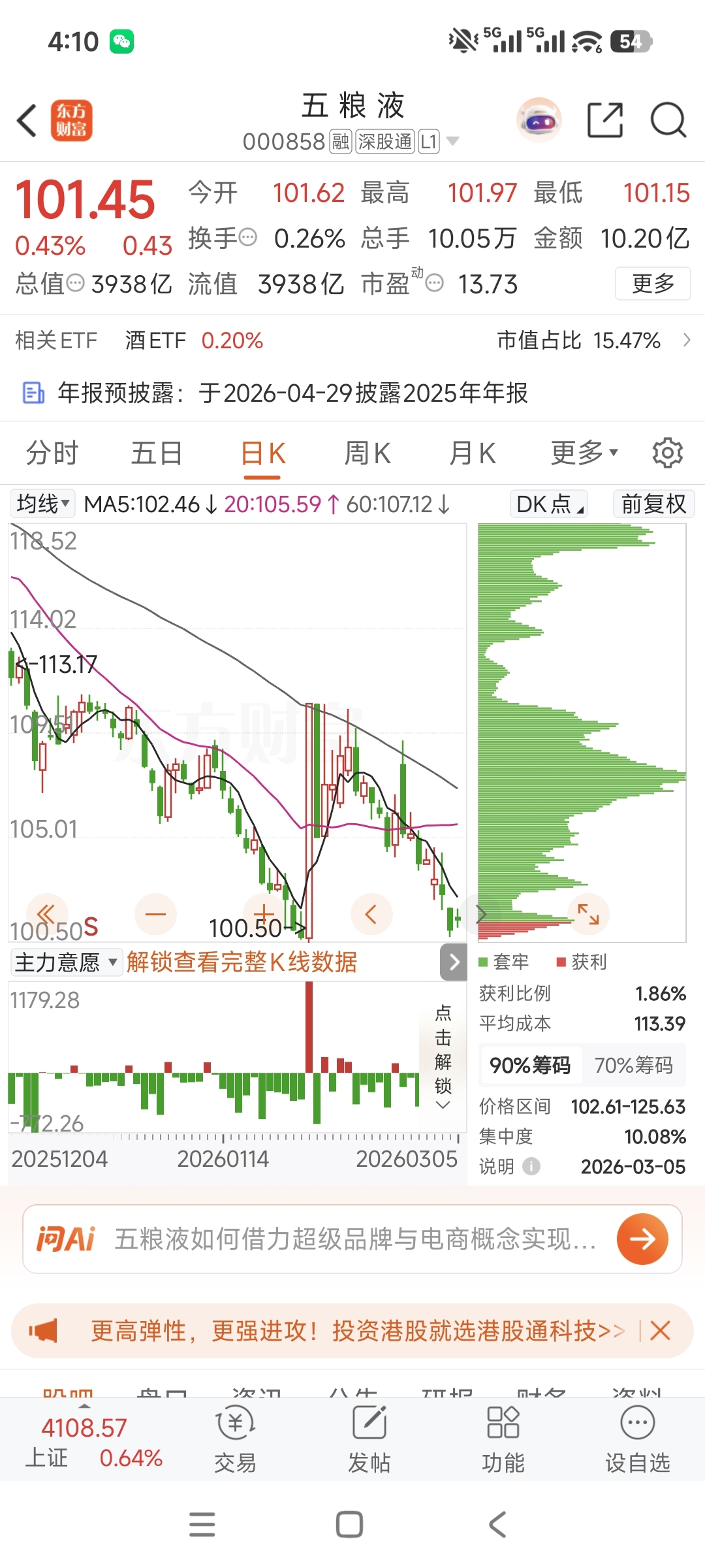 $五 粮 液(SZ000858)$ 五粮液竟然还没有破百?在众多白酒相继创新低的情况下,五粮液还在坚守着100的防线!