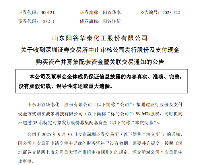 和国风一起中止的阳谷华泰已经公告了原因,就是“财务资料已过有效期,需要补充提交”