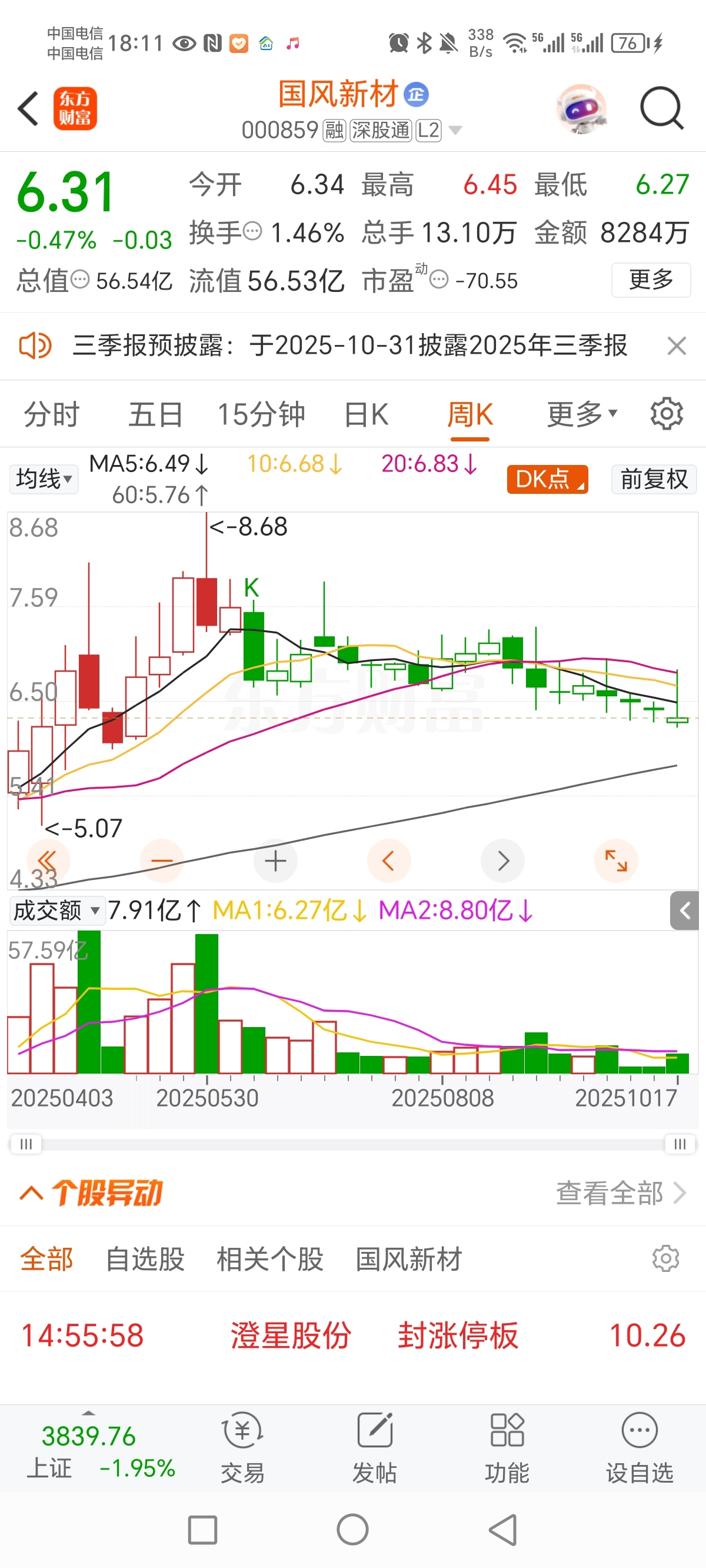 $国风新材(SZ000859)$ 60周线5.76更稳妥一些,5.80再加仓