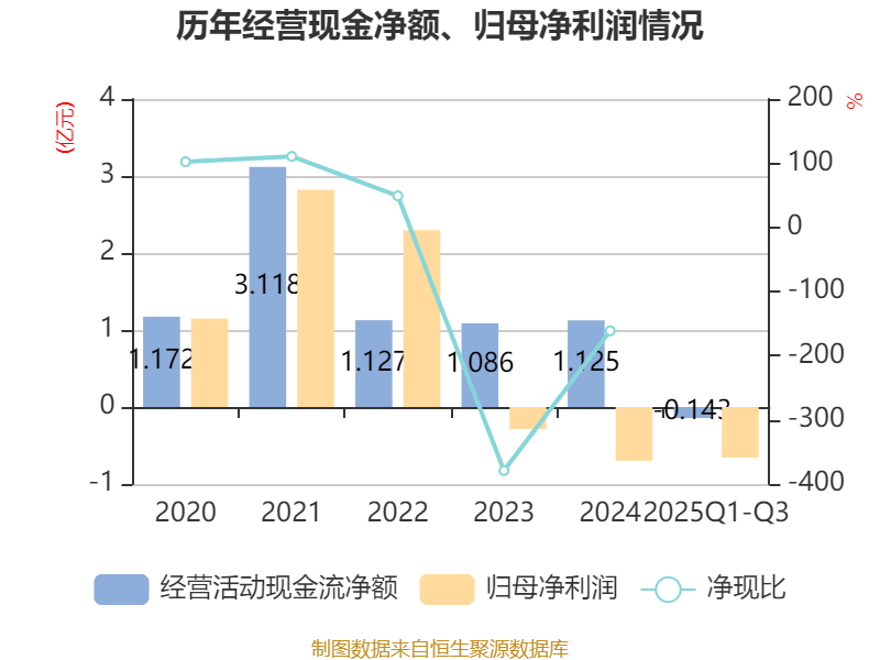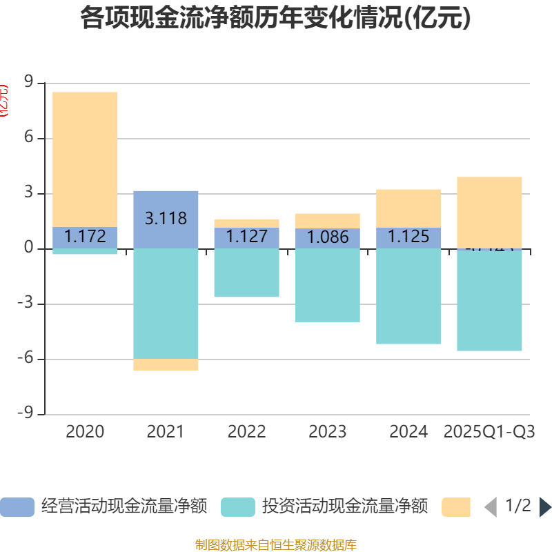 2025年前三季度,公司经营活动现金流净额为-1425.9万元,同比增加2884.01万元;筹资活动现金流净额3.89亿元,同比增加2.73亿元;投资活动现金流净额-5.43亿元,上年同期为-3.74亿元。