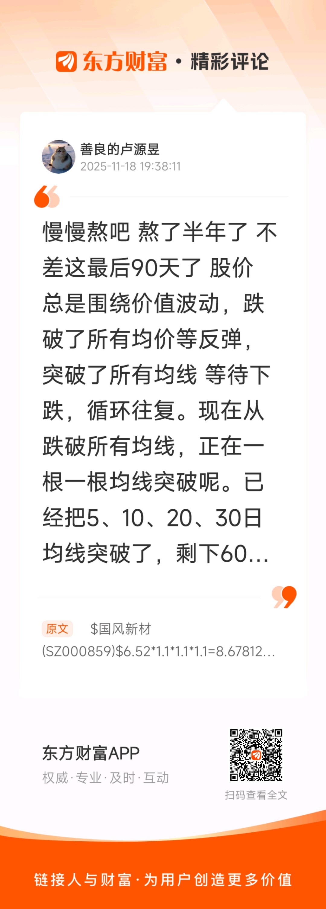 $国风新材(SZ000859)$ 6.52*1.1*1.1*1.1=8.67812。不知不觉中,深度套牢了,今天6.52元,差3个涨停板才能到8.68元。5月26号至11月26号就跌半年时间了。