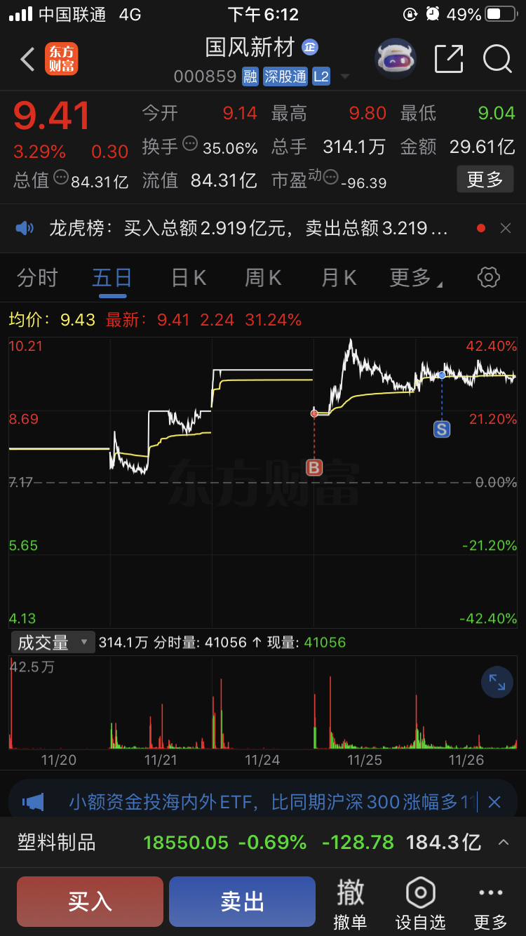 $国风新材(SZ000859)$ 今天表现还不错,就是换手高了点,赚点就走,可惜没卖到高点。