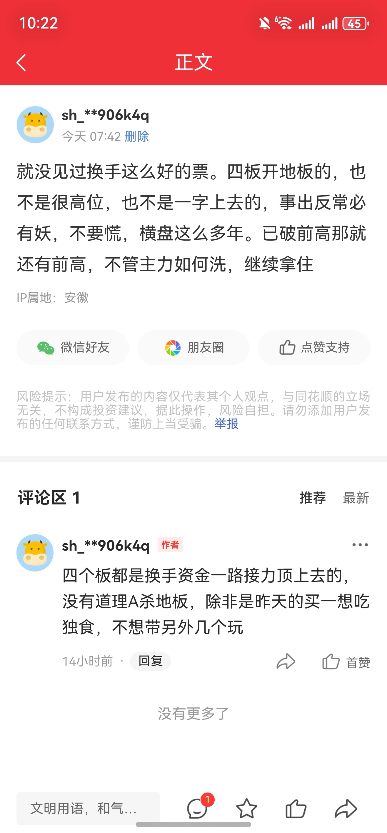 温馨提示: 1.根据《证券法》规定,禁止编造、传播虚假信息或者误导性信息,扰乱证券市场;2.用户在本社区发表的所有资料、言论等仅代表个人观点,与本网站立场无关,不对您构成任何投资建议。用户应基于自己的独立判断,自行决定证券投资并承担相应风险。《东方财富社区管理规定》