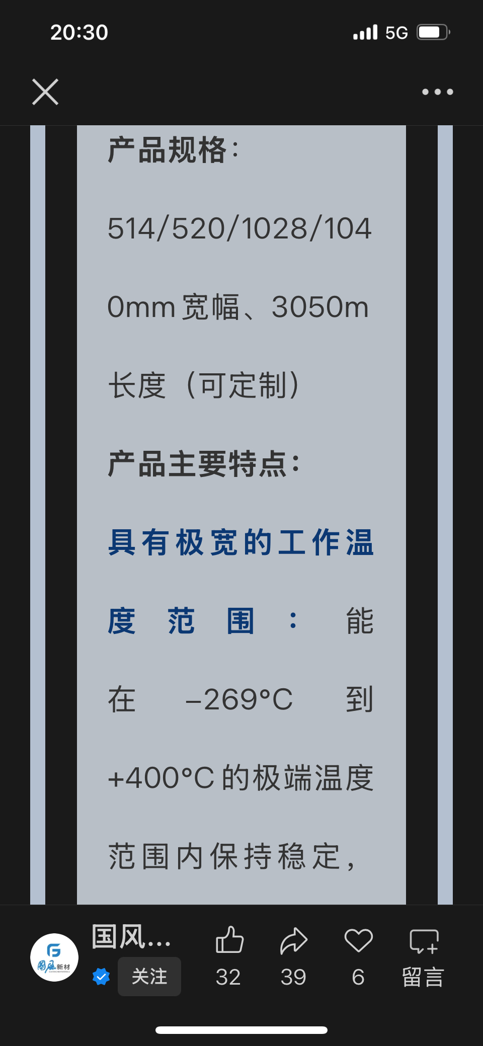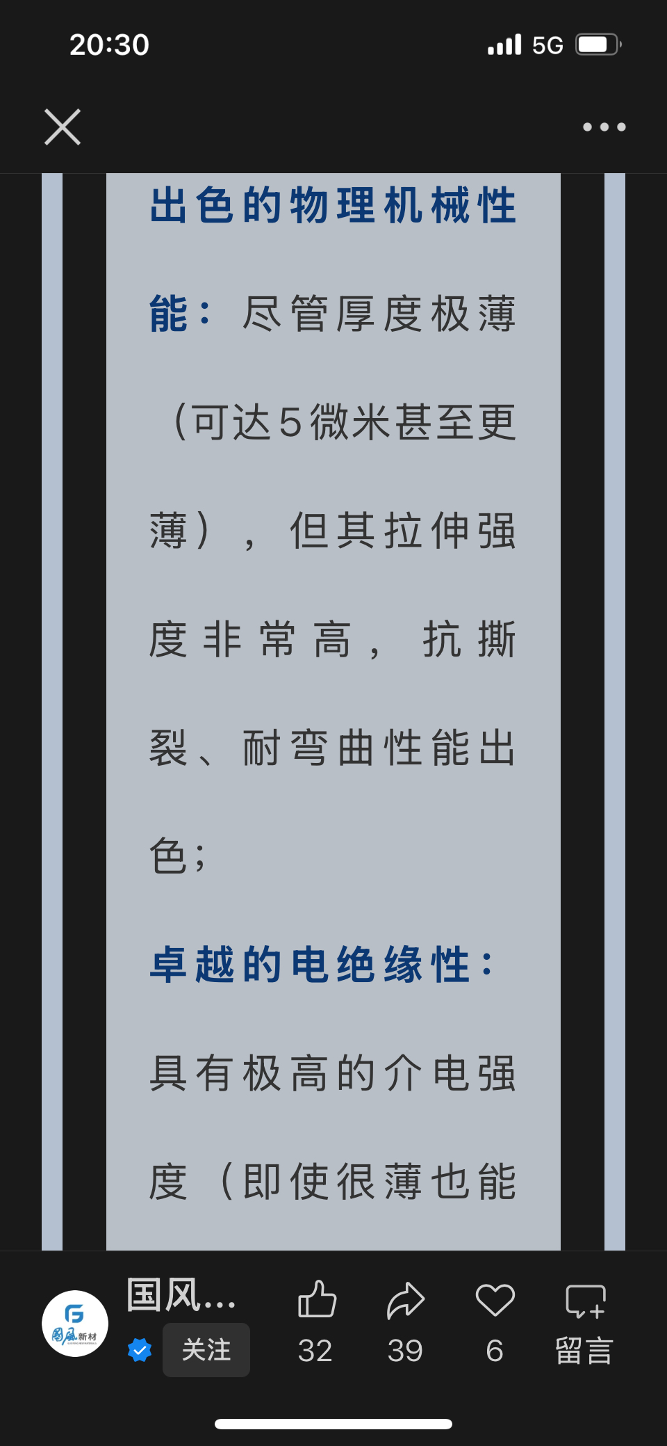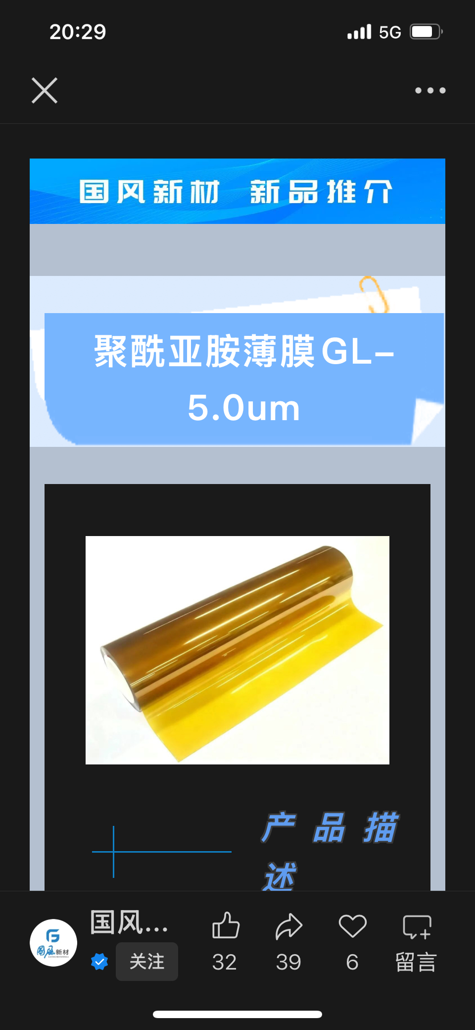$国风新材(SZ000859)$ 国风新品聚酰亚胺薄膜GL−5.0um上市
