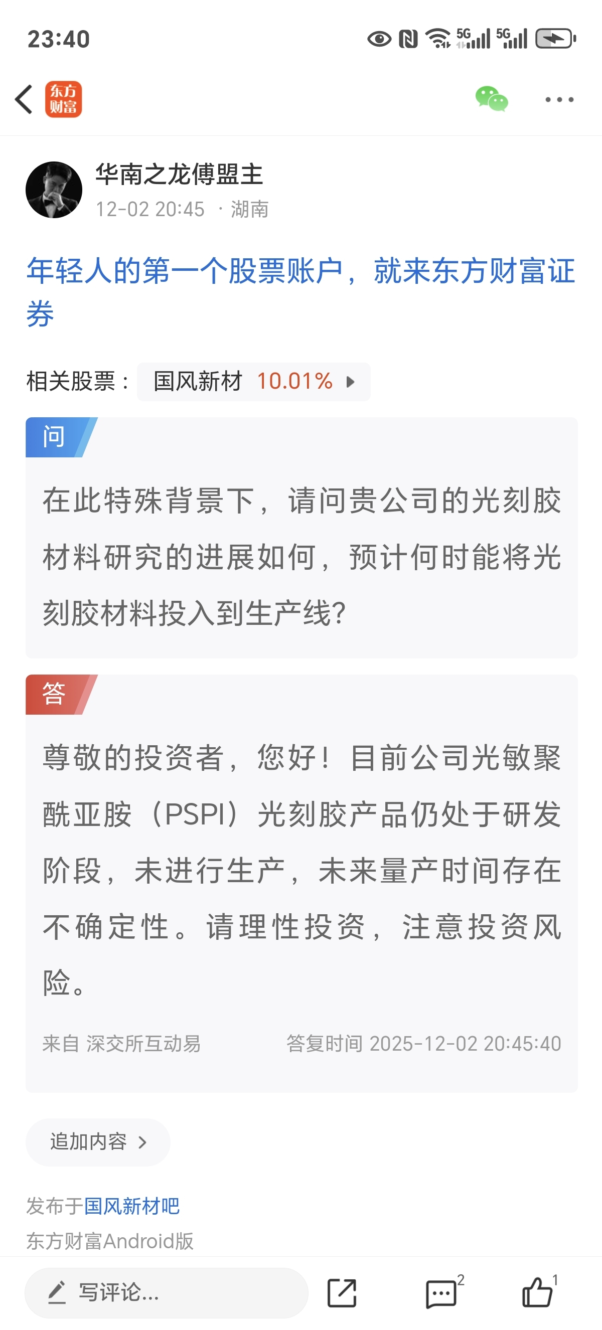 $国风新材(SZ000859)$ 我提问的时间是11.27.今天回复的,各位细品吧!