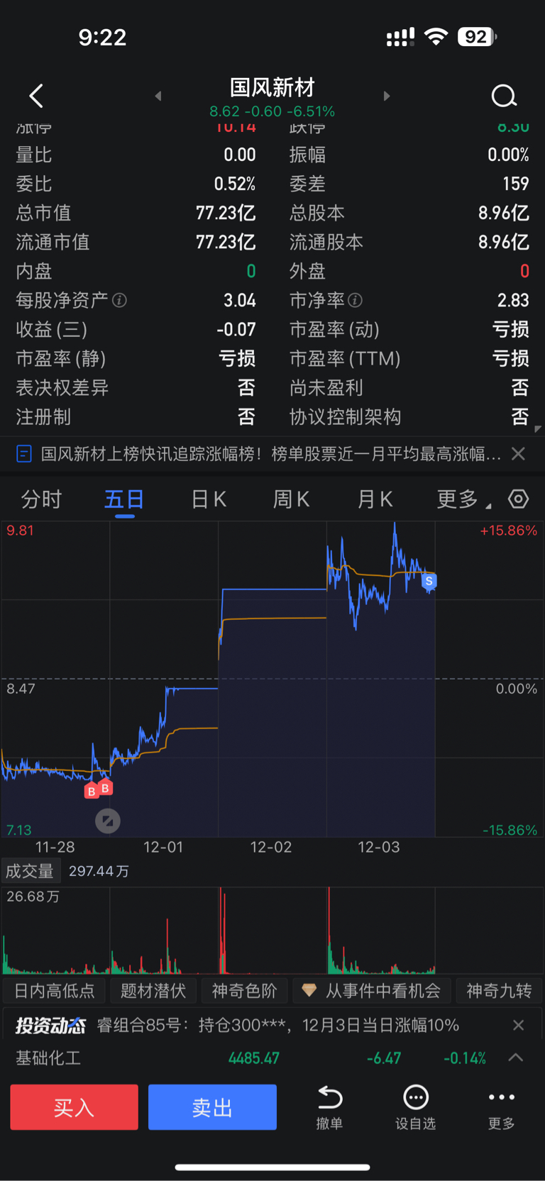 $国风新材(SZ000859)$ 昨天高点没出格局了一会,尾盘不及预期还是出来了