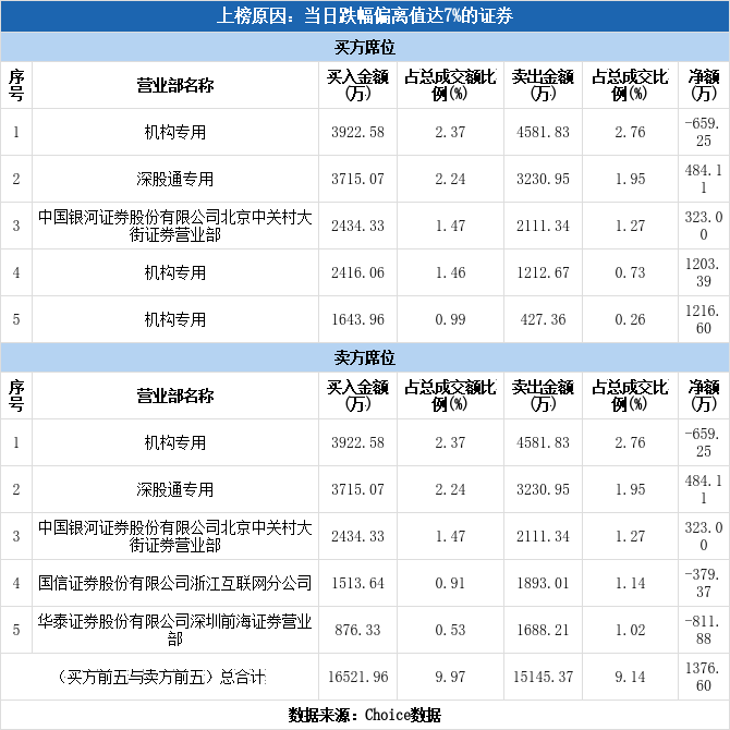 深交所2025年12月4日交易公开信息显示,国风新材因属于当日跌幅偏离值达7%的证券而登上龙虎榜。国风新材当日报收8.30元,涨跌幅为-9.98%,偏离值达-9.90%,换手率21.43%,振幅9.98%,成交额16.57亿元。